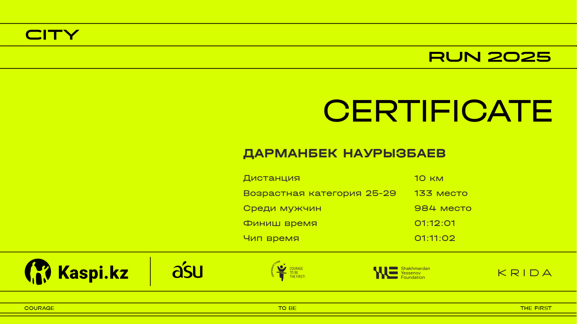 | 1007 | Даурен Аскаров | ![]() | Almaty | 1941 | 00:16:28 | 00:26:48 | 00:38:13 | 00:50:02 | 00:59:33 | 01:00:59 | 00:59:49 | Скачать |