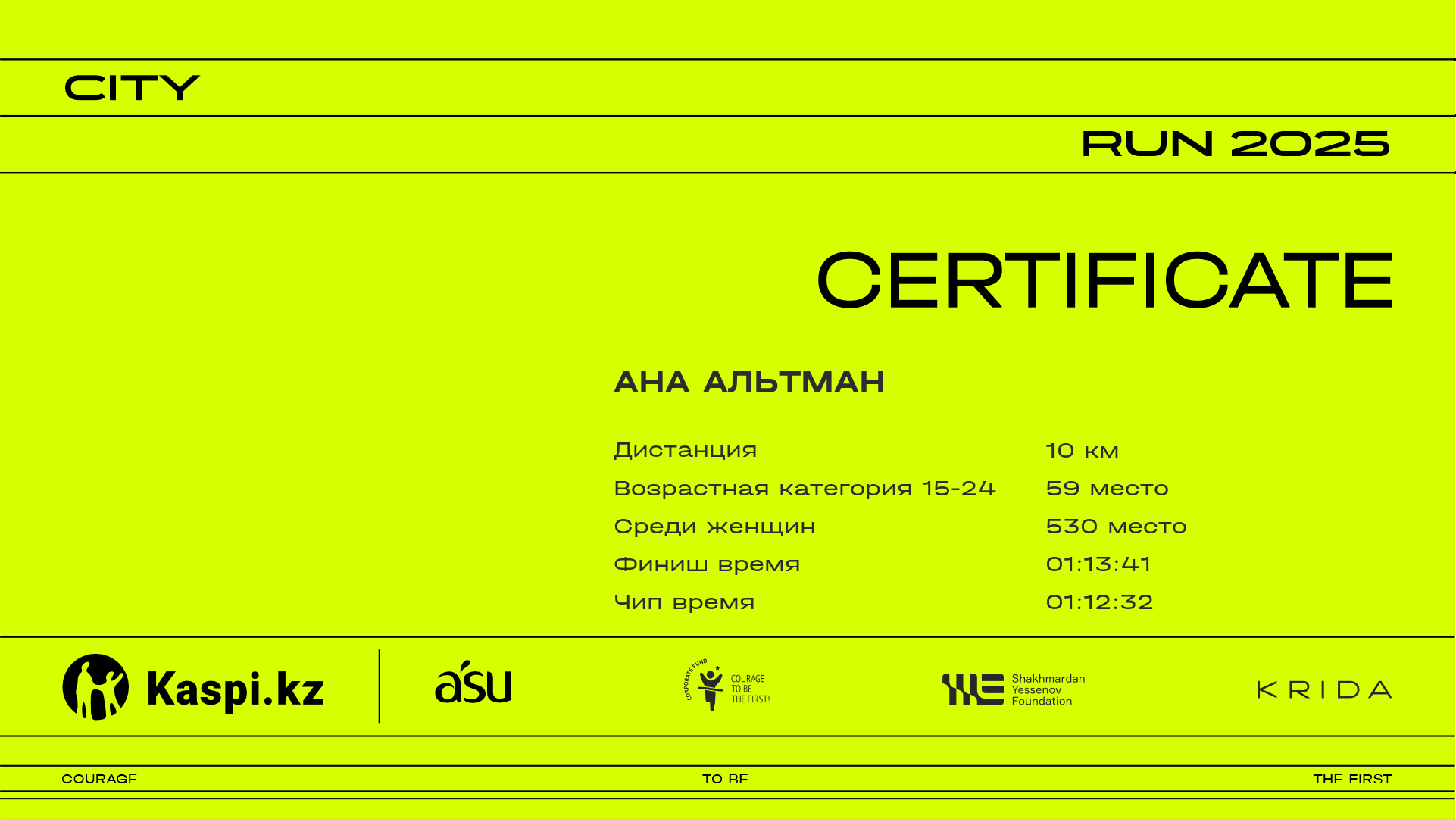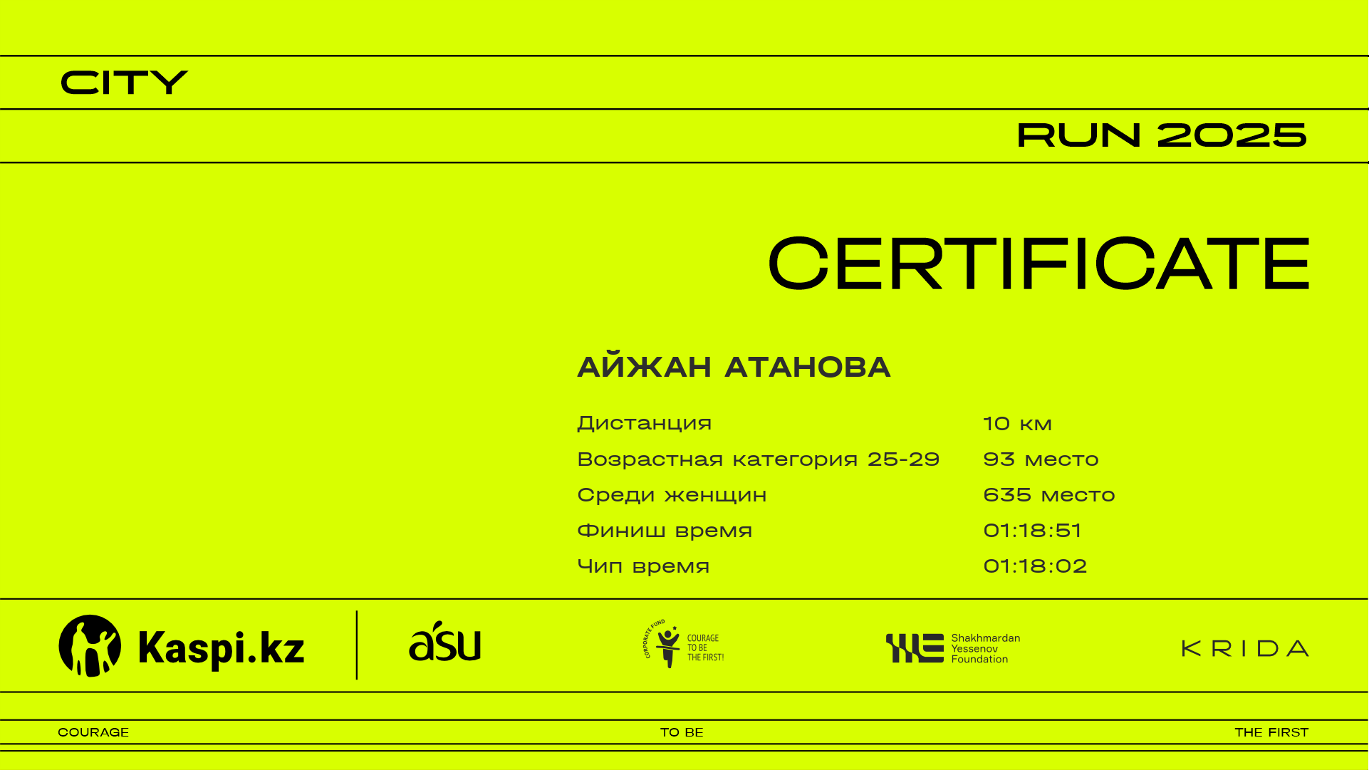 | 1892 | Асем Мейржан | ![]() | Алматы | 82 | 00:23:38 | 00:39:23 | 00:58:41 | 01:17:46 | 01:32:40 | 01:34:13 | 01:33:01 | Скачать |