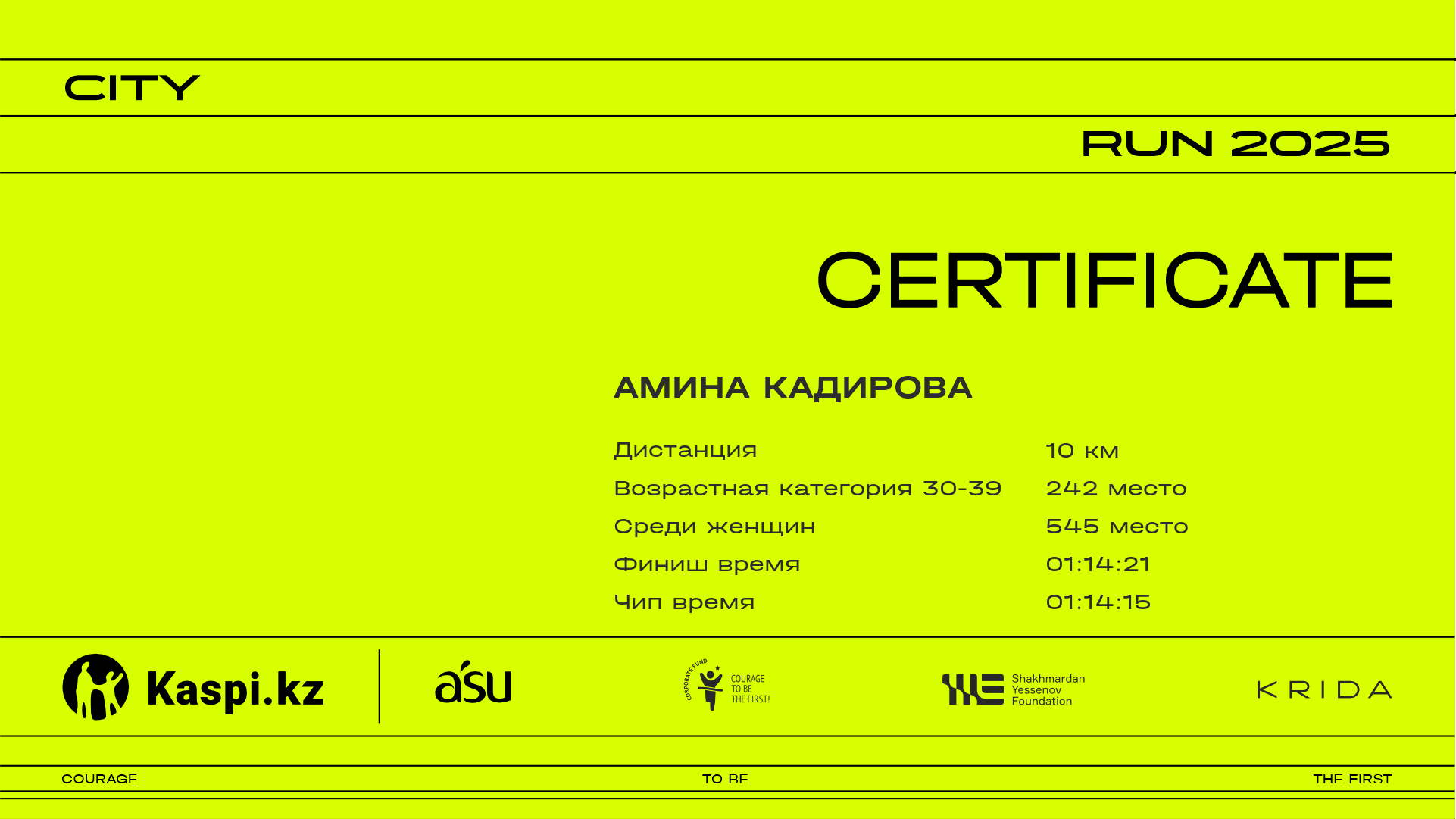 | 1084 | Асель Тунгыш | ![]() | Алматы | 582 | 00:17:29 | 00:27:54 | 00:39:29 | 00:51:40 | 01:01:13 | 01:02:25 | 01:01:15 | Скачать |