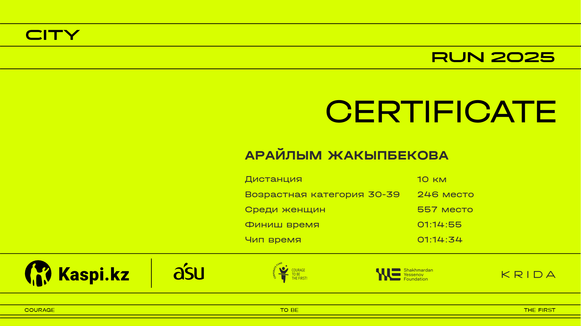 | 1576 | Карина Бекжанова | ![]() | Алматы | 598 | 00:20:09 | 00:33:29 | 00:47:52 | 01:02:10 | 01:12:51 | 01:14:33 | 01:13:15 | Скачать |