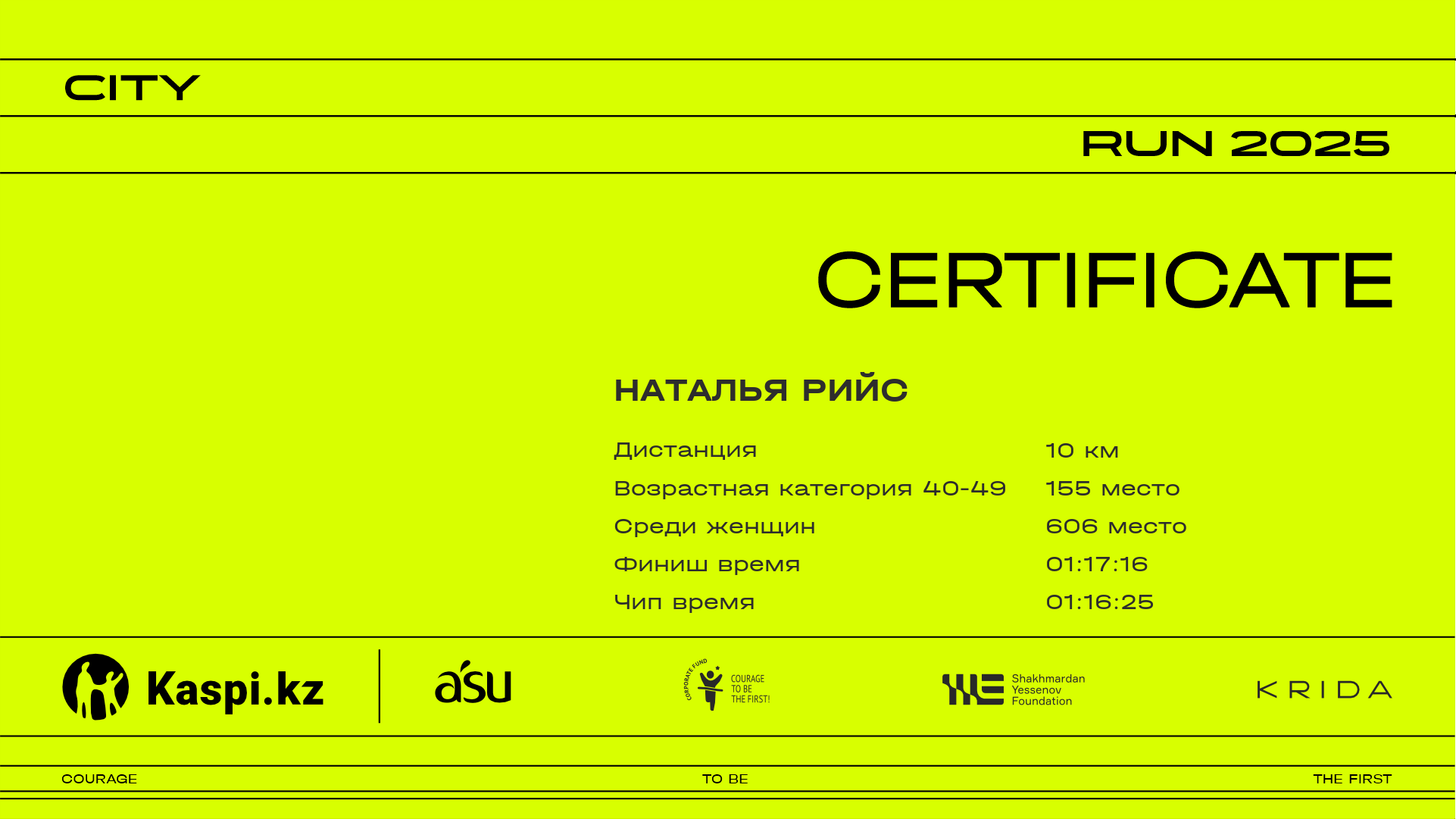 | 1677 | Assel Aimanova | ![]() | Almaty | 713 | 00:20:05 | 00:33:40 | 00:48:44 | 01:04:01 | 01:15:45 | 01:17:34 | 01:16:36 | Скачать |