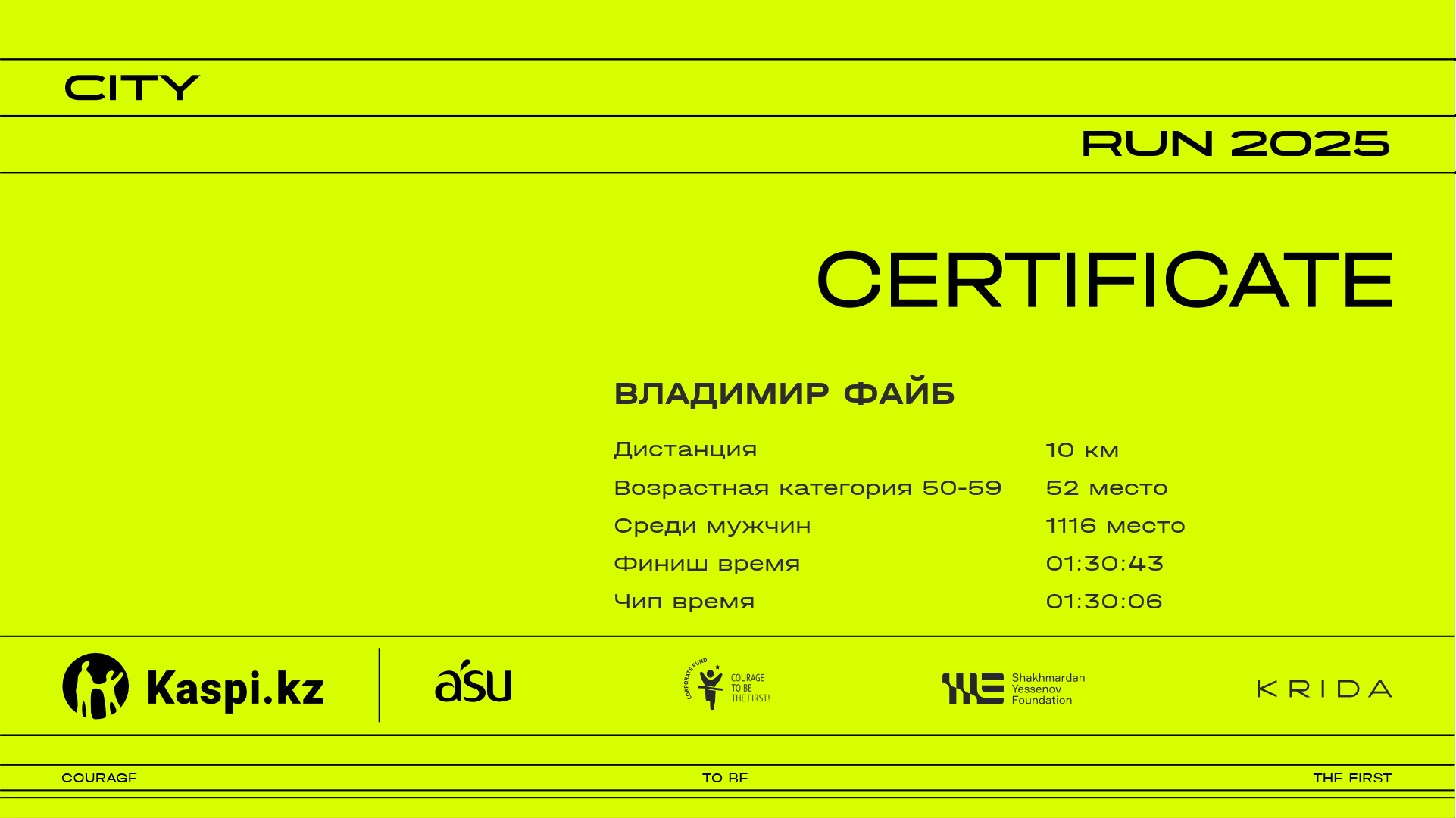 | 1888 | Dinara Saidova | ![]() | Алматы | 477 | 00:24:00 | 00:41:41 | 00:59:39 | 01:17:29 | 01:31:02 | 01:32:56 | 01:32:50 | Скачать |