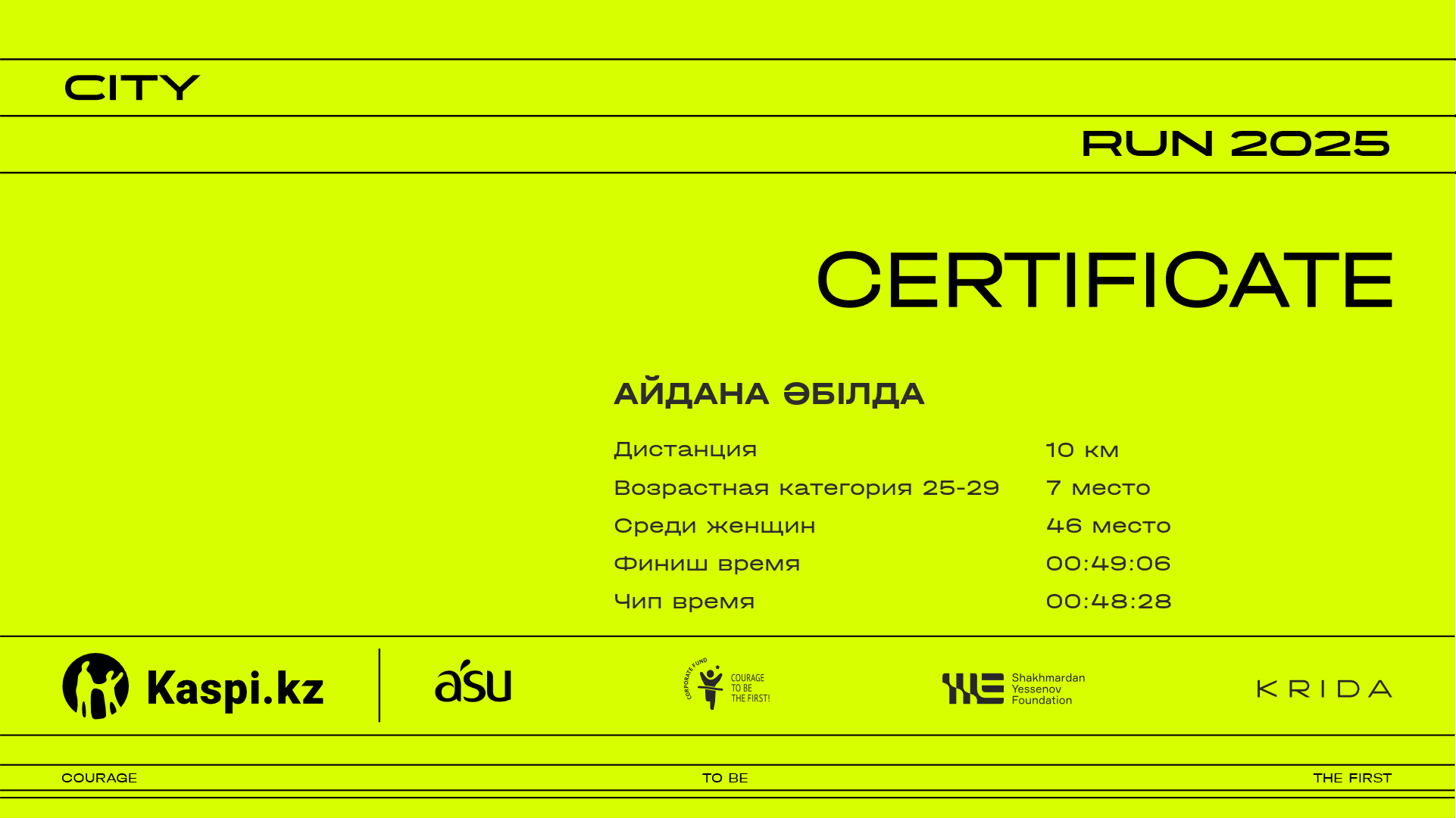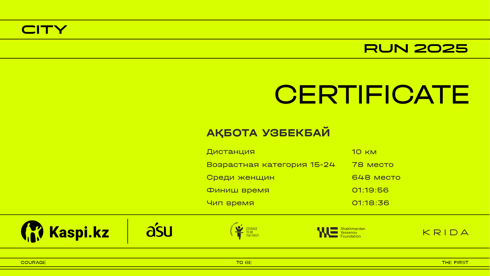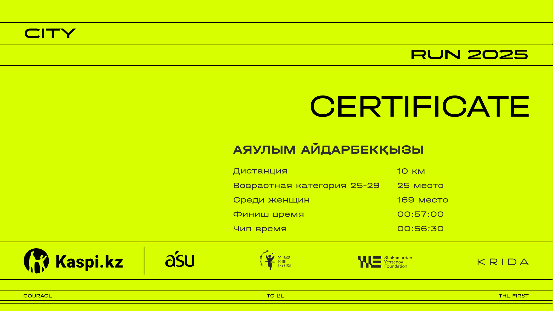 | 1223 | Anelya Akbayeva | ![]() | Almaty | 31 | 00:16:14 | 00:28:01 | 00:40:41 | 00:53:33 | 01:03:25 | 01:04:58 | 01:04:51 | Скачать |