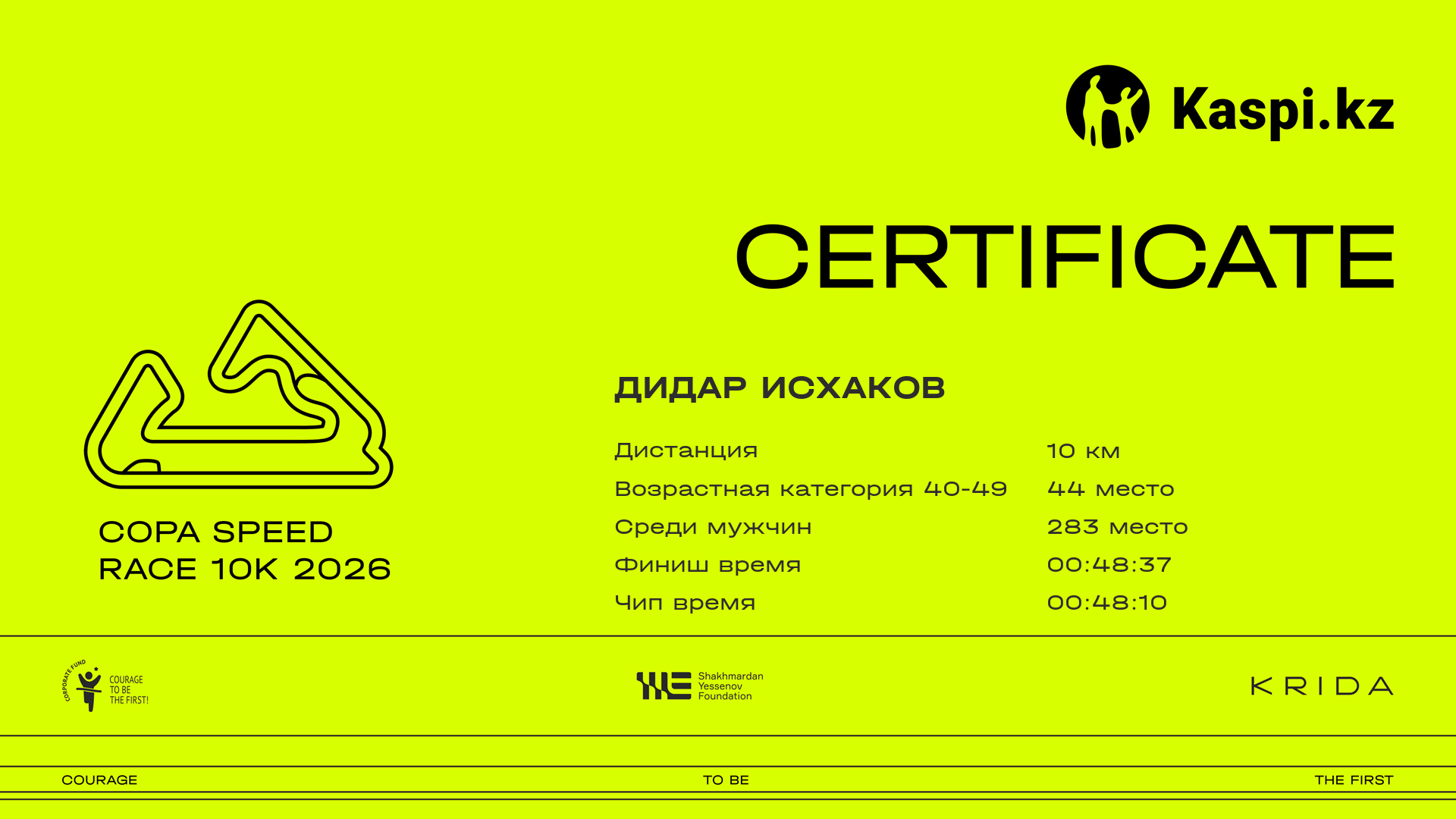 | 321 | Дидар Исхаков | ![]() | Алматы | 404 | 00:10:23.34 | 00:18:36.90 | 00:24:26.11 | 00:34:29.46 | 00:43:05.75 | 00:48:37.34 | 00:48:10.88 | Скачать |