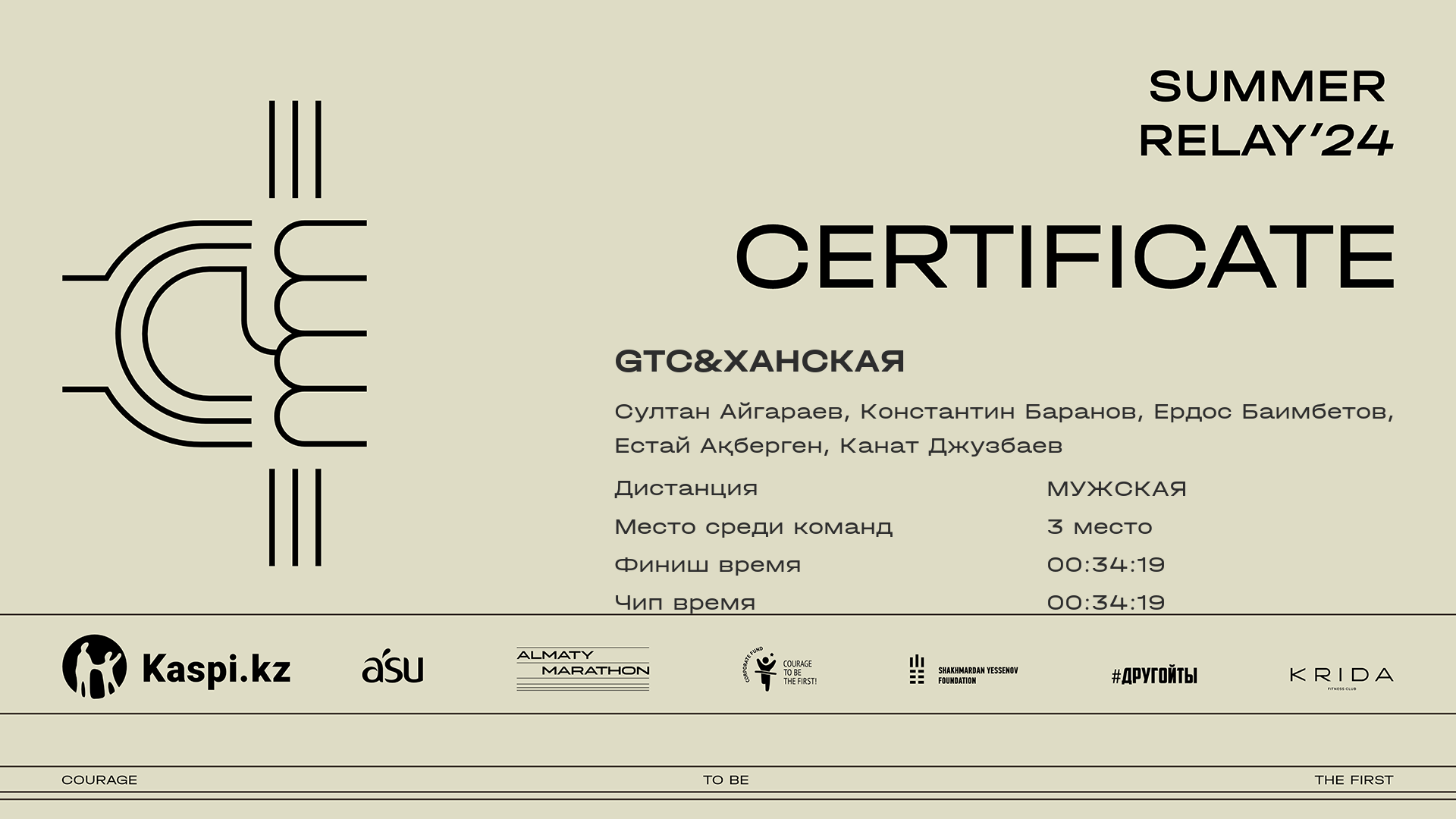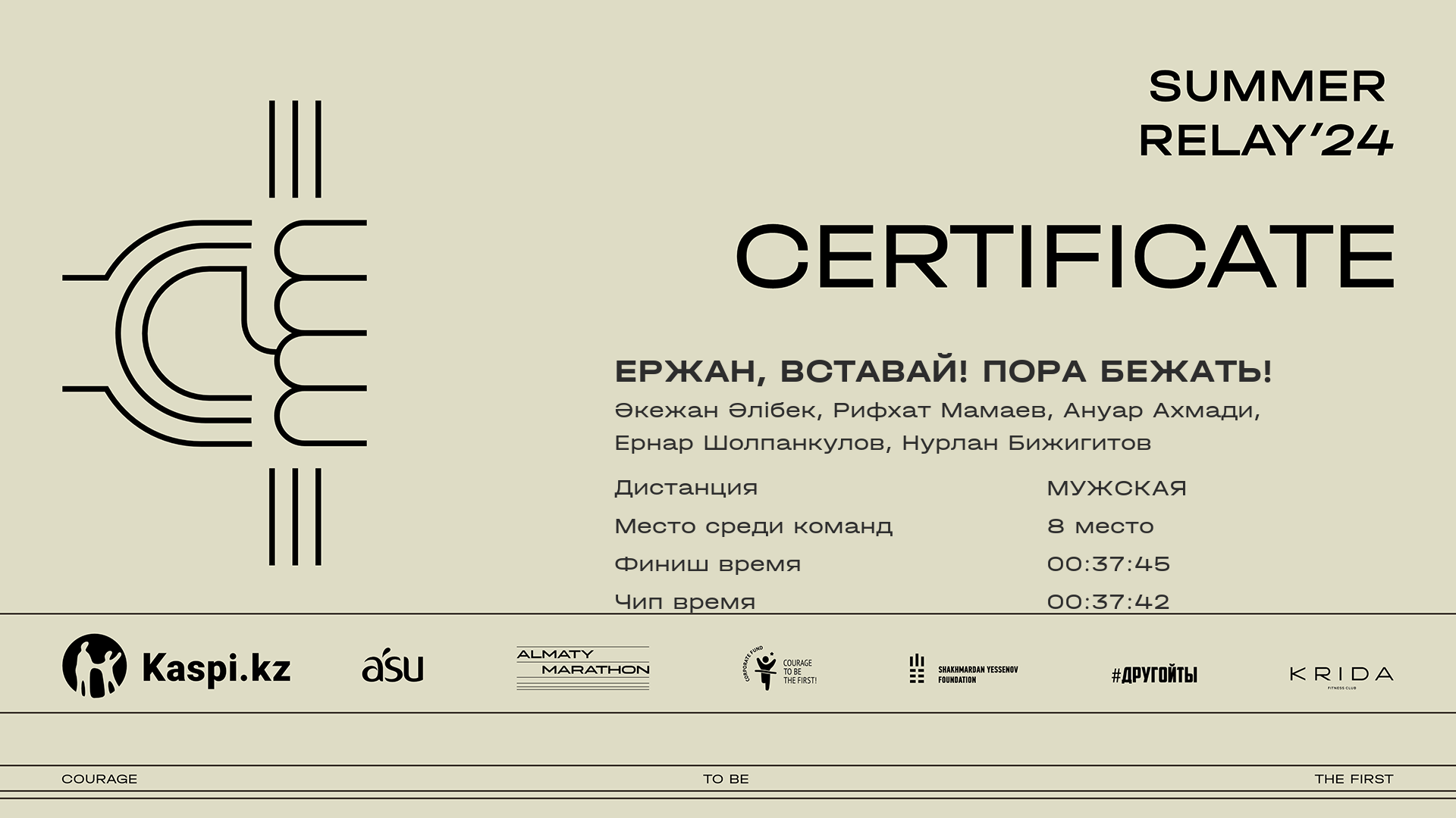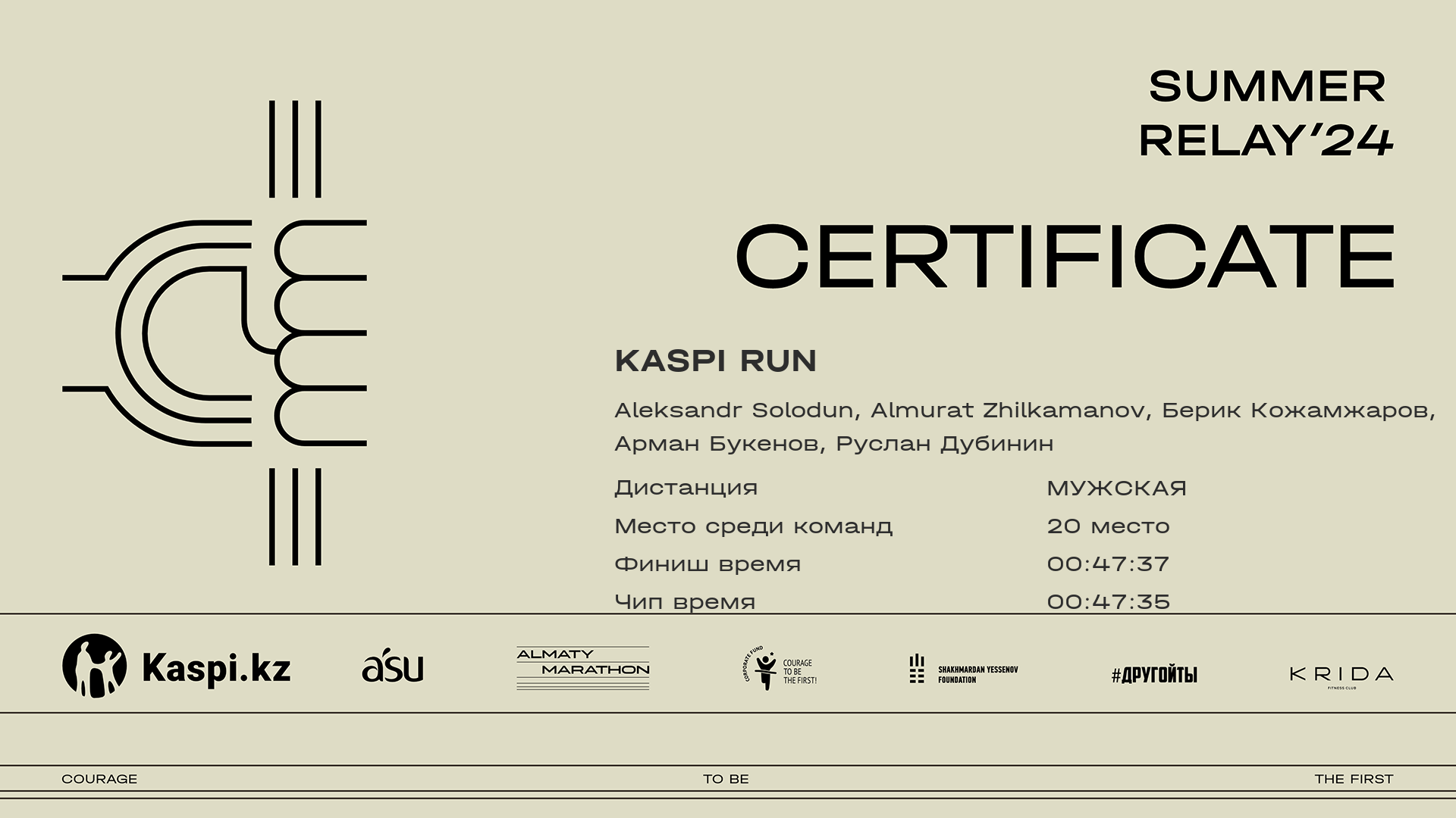 | 20 | Kaspi Run: Aleksandr Solodun, Almurat Zhilkamanov, Берик Кожамжаров, Арман Букенов, Руслан Дубинин |  | Алматы | 15 | 00:09:37.69 | 00:08:30.88 | 00:11:45.45 | 00:09:39.13 | 00:47:37.89 | 00:47:35.83 | Скачать |