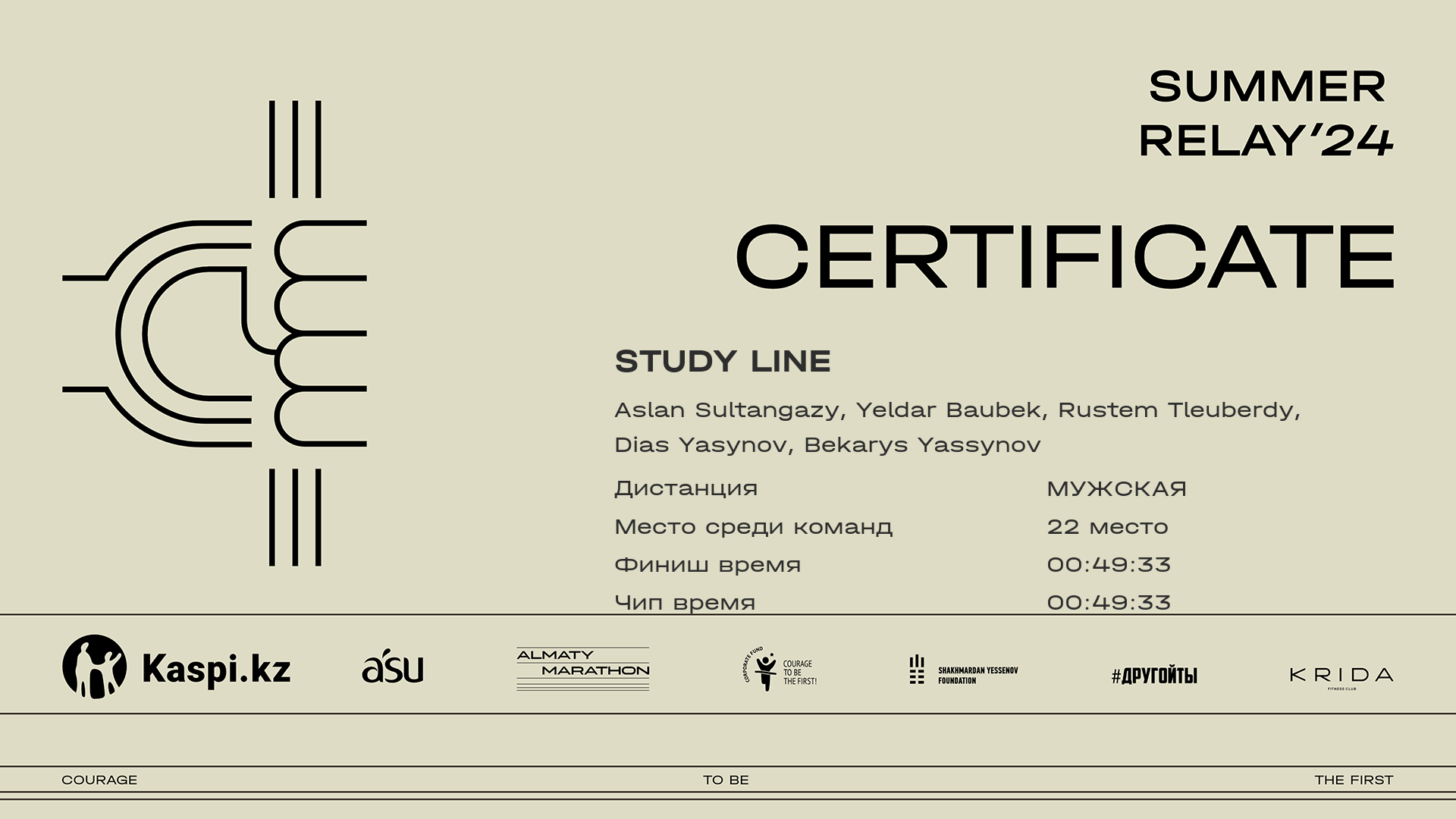 | 22 | Study Line: Aslan Sultangazy, Yeldar Baubek, Rustem Tleuberdy, Dias Yasynov, Bekarys Yassynov |  | Алматы | 22 | 00:08:56.46 | 00:09:42.56 | 00:10:00.43 | 00:09:39.55 | 00:49:33.22 | 00:49:33.22 | Скачать |