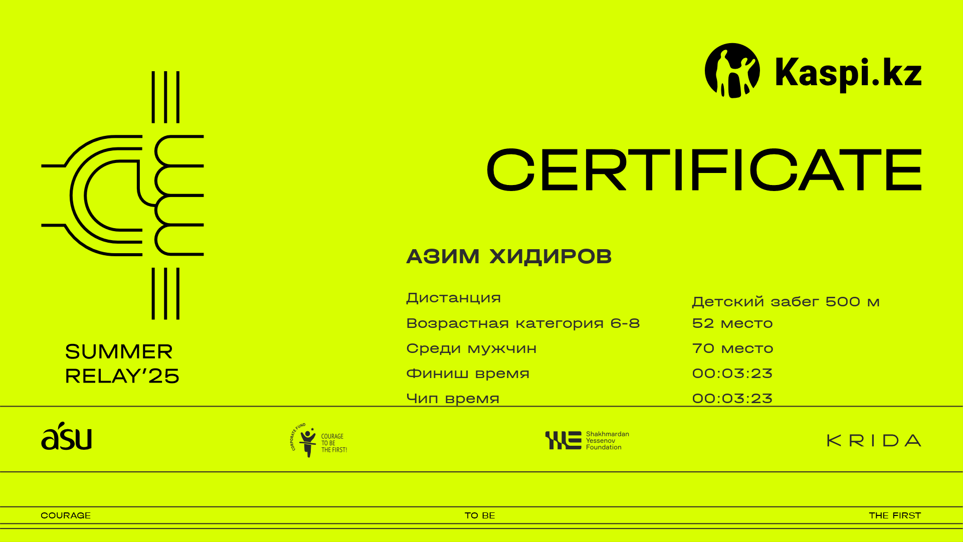 | 128 | Erkenaz Bauk | ![]() | Almaty | 32 | 00:03:29.90 | 00:03:29.90 | Скачать |