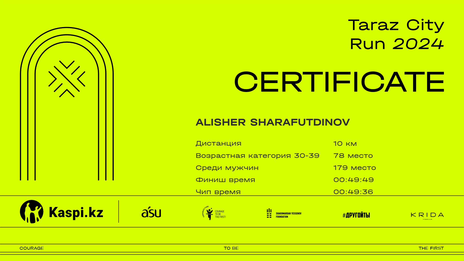 | 275 | Kazybek Uzakbayev | ![]() | Тараз | 23 | 00:11:44.50 | 00:25:39.90 | 00:39:56.80 | 00:53:55.80 | 00:53:48.00 | Скачать |