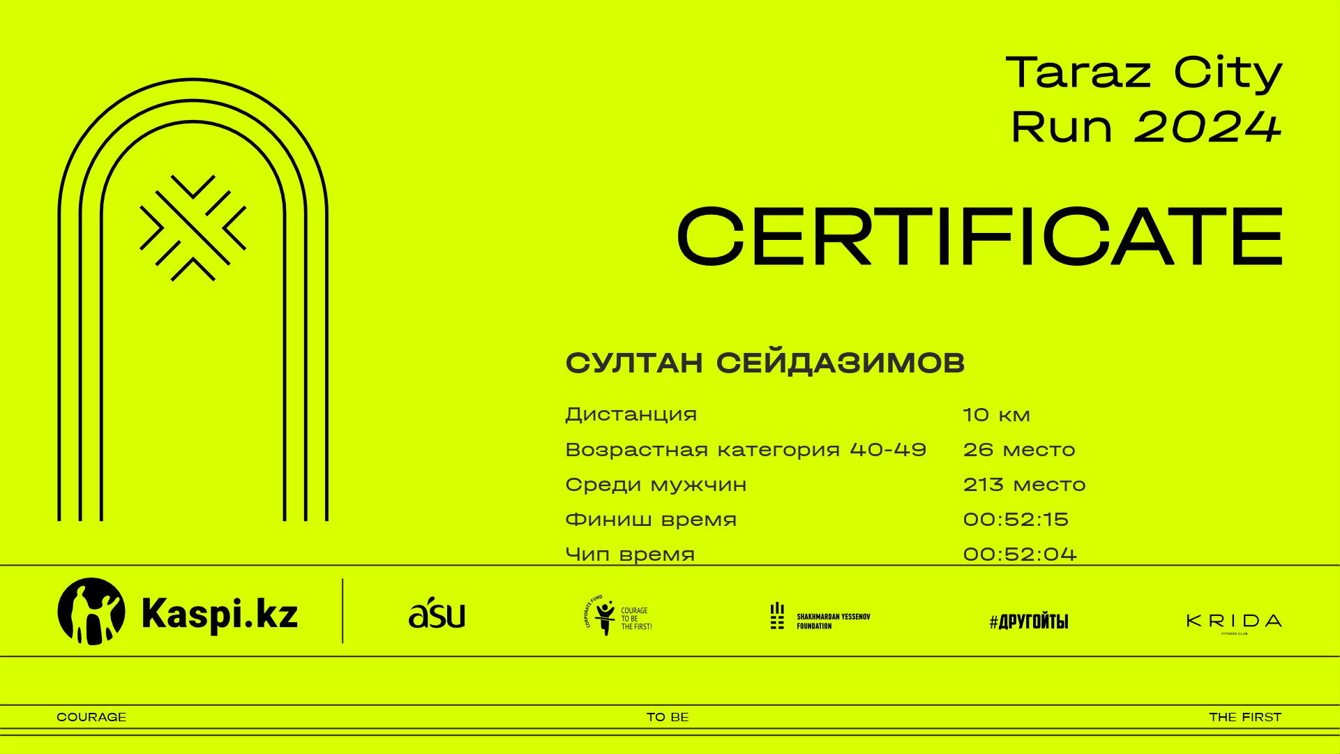 | 268 | Yerlan Aryn | ![]() | Shymkent | 419 | 00:11:52.10 | 00:25:43.20 | 00:39:35.60 | 00:53:33.70 | 00:53:29.40 | Скачать |