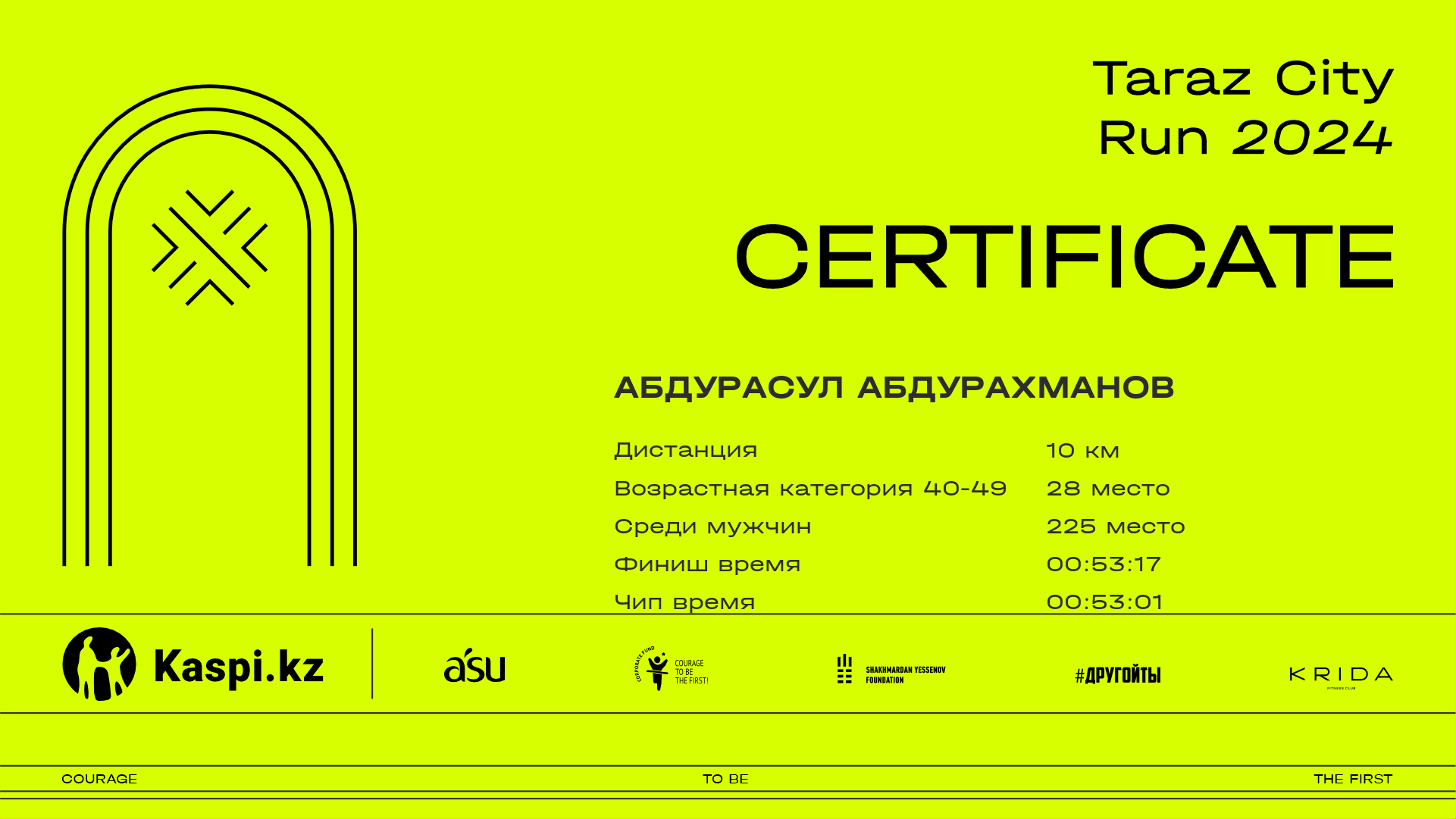 | 263 | Nurahmet Azhibek | ![]() | Шымкент | 357 | 00:11:58.80 | 00:25:33.70 | 00:39:54.50 | 00:53:21.40 | 00:53:15.20 | Скачать |