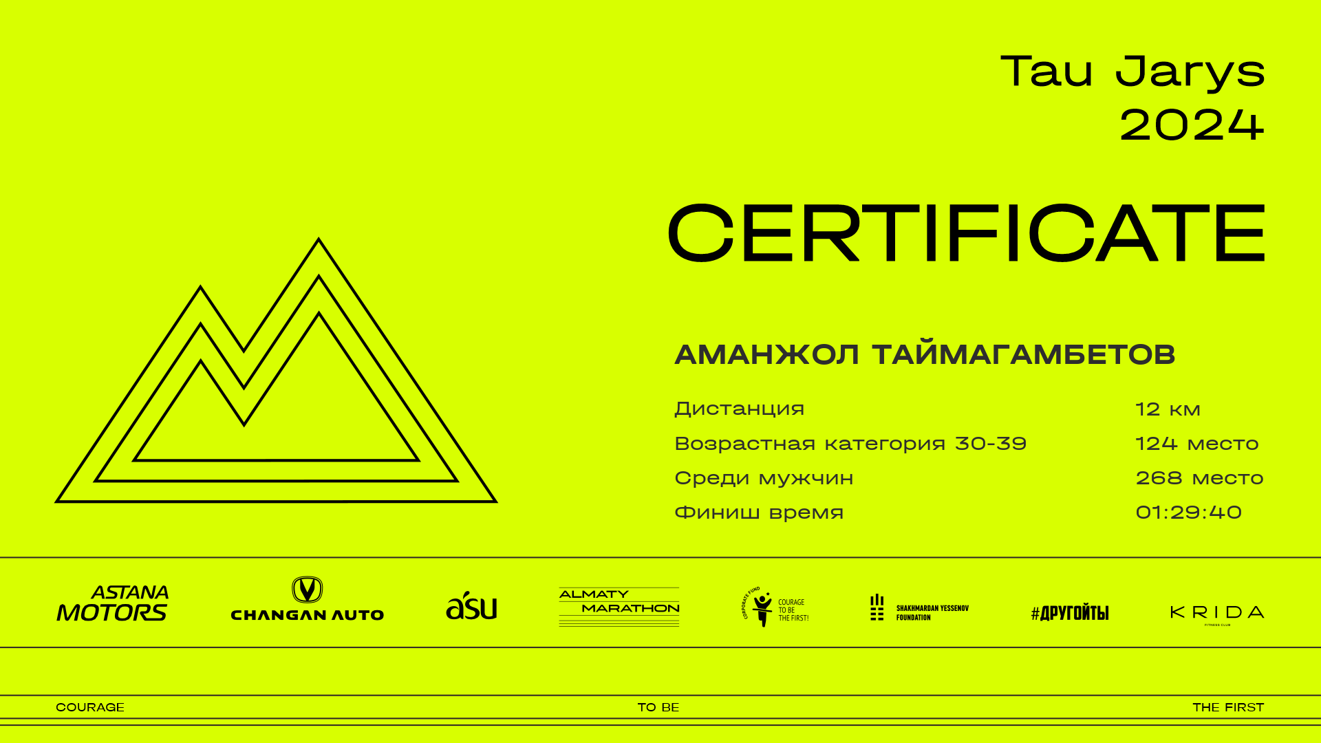 | 275 | Aibek Amanov | ![]() | Almaty | 323 | 00:12:05.20 | 00:28:57.94 | 00:53:54.60 | 01:11:59.43 | 01:25:06.85 | 01:24:56.79 | Скачать |