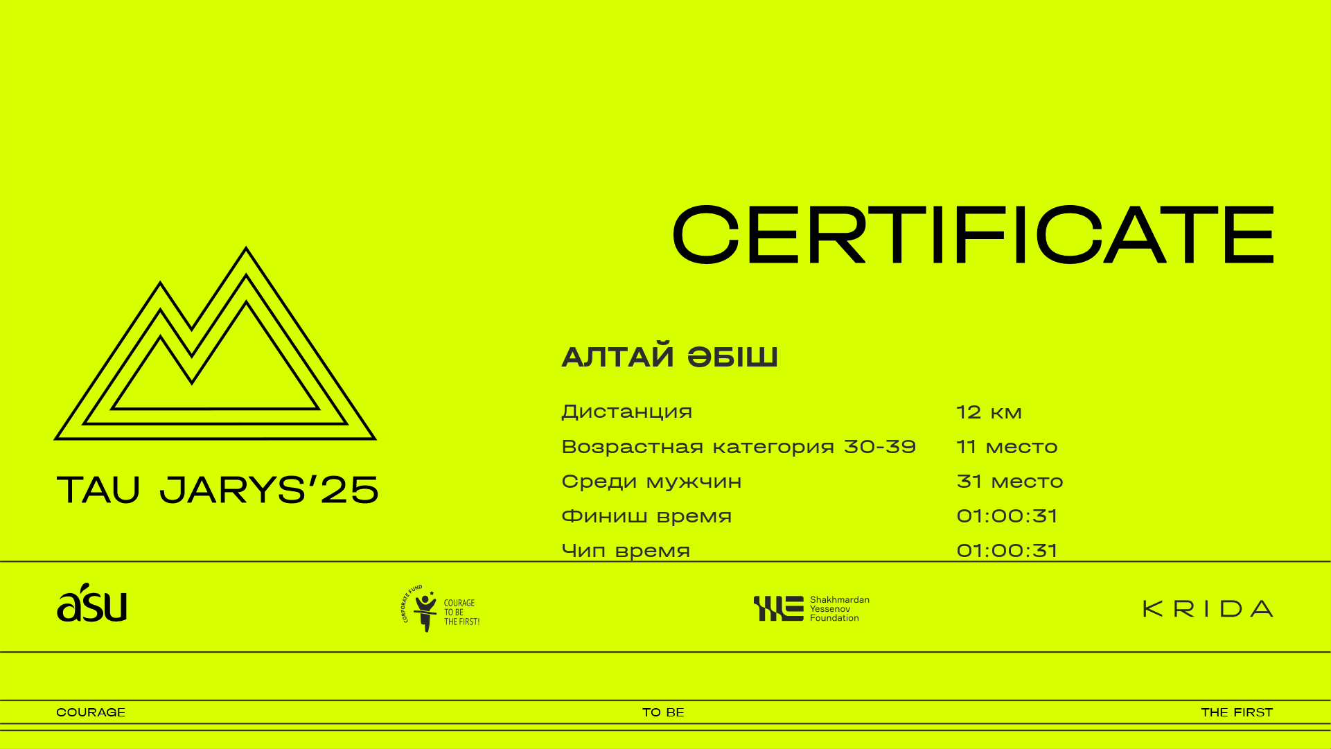 | 34 | Алтай Әбіш | ![]() | Алматы | 298 | 00:09:40.80 | 00:28:53.30 | 00:40:24.20 | 01:00:31.60 | 01:00:31.10 | Скачать | |||