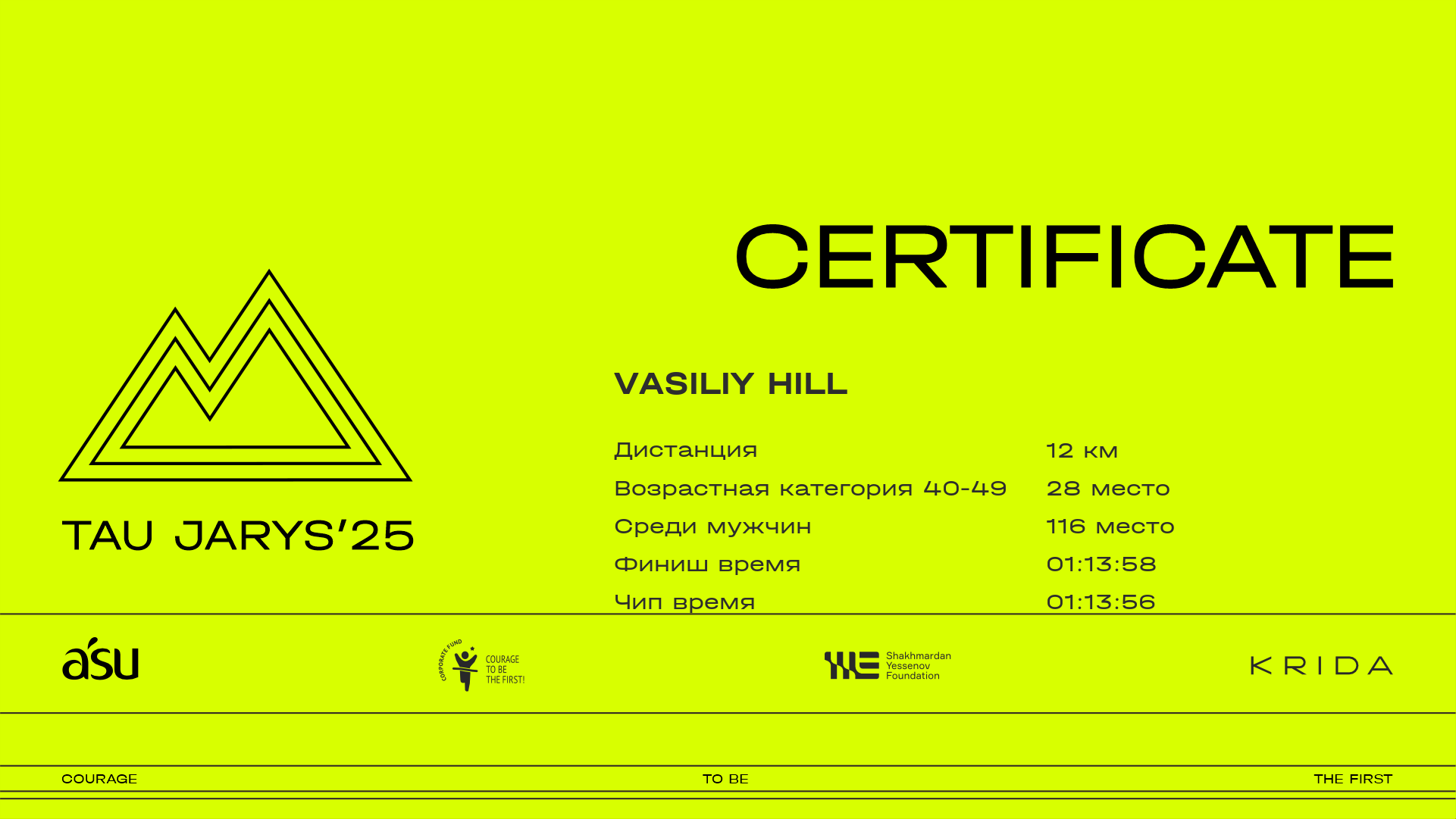 | 134 | Айбек Шамиль | ![]() | Алматы | 490 | 00:08:17.00 | 00:22:17.90 | 00:30:08.50 | 00:46:38.10 | 01:01:23.40 | 01:08:15.10 | 01:14:20.00 | 01:14:08.20 | Скачать |