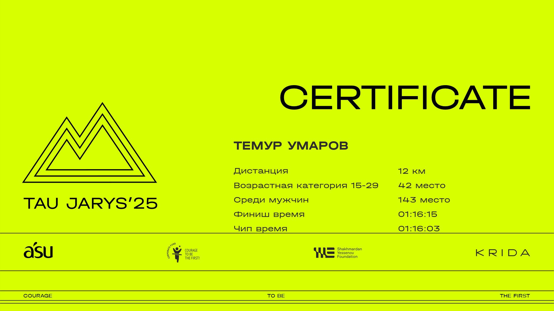 | 160 | Темур Умаров | ![]() | Almaty | 492 | 00:08:30.10 | 00:21:19.50 | 00:28:17.60 | 00:45:18.60 | 01:01:16.10 | 01:09:24.80 | 01:16:15.20 | 01:16:03.60 | Скачать |