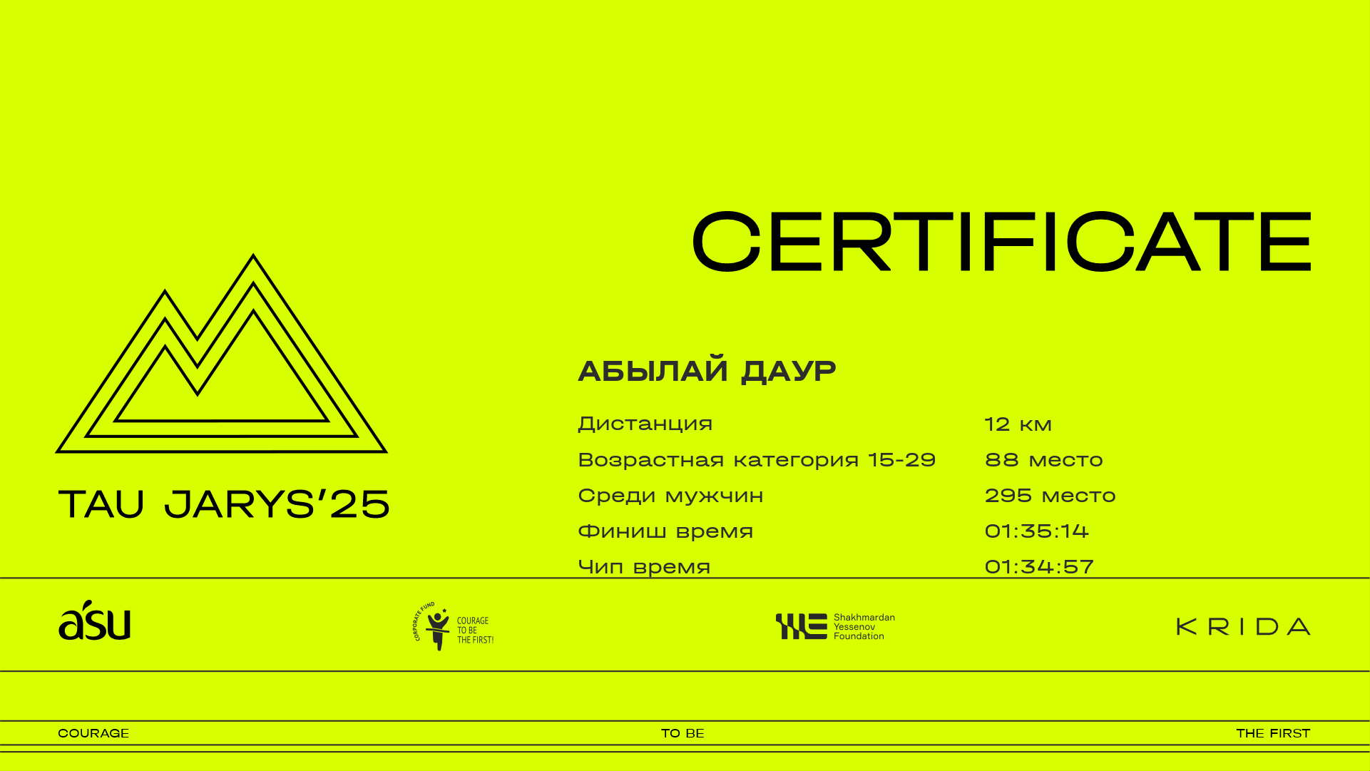 | 439 | Айдар Қонысбай | ![]() | Алматы | 310 | 00:12:19.20 | 00:32:30.60 | 00:42:27.60 | 01:04:53.80 | 01:26:22.50 | 01:37:25.60 | 01:46:20.00 | 01:46:12.40 | Скачать |