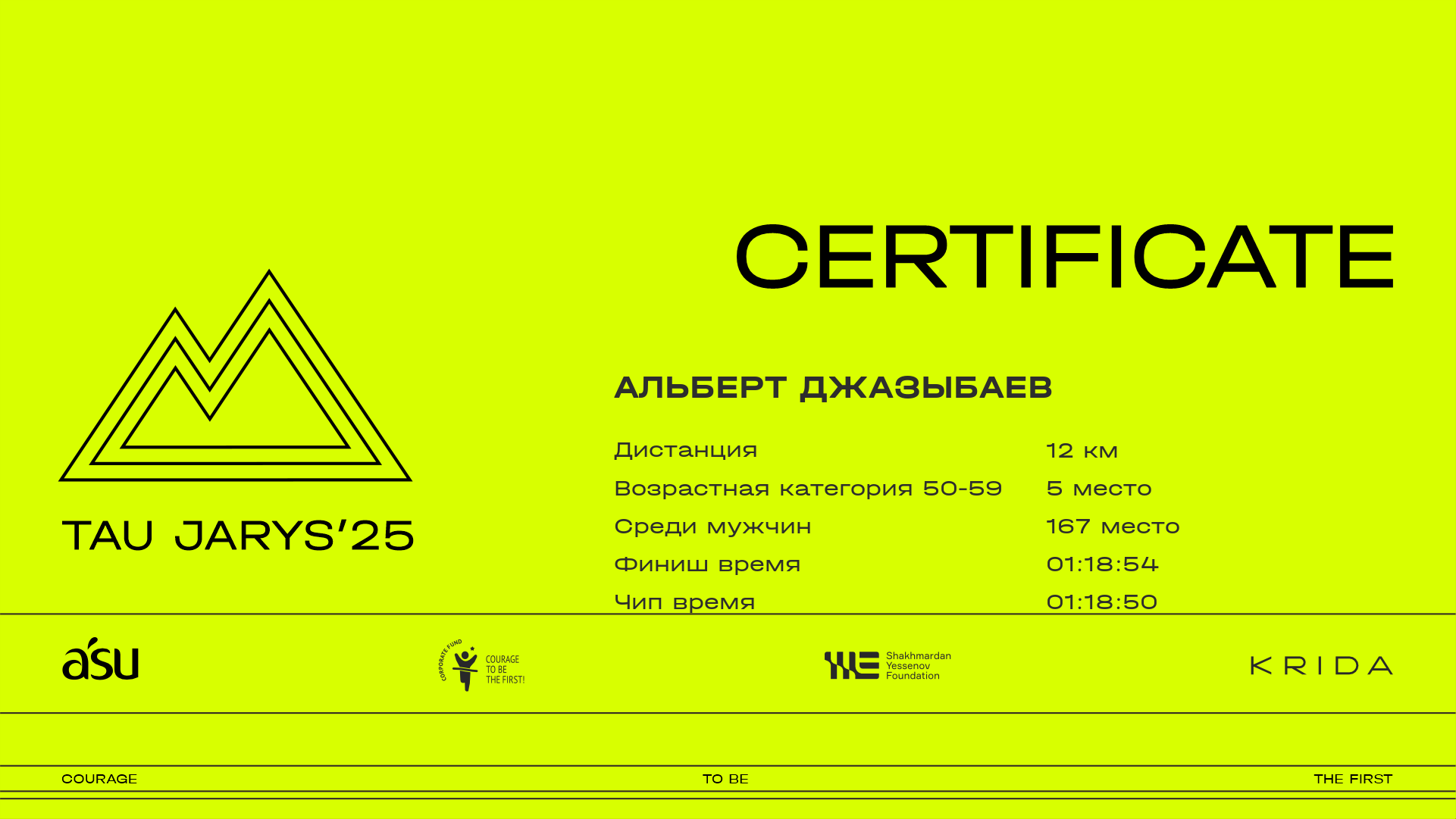 | 206 | Yeldos Temirgaliyev | ![]() | Алматы | 155 | 00:10:46.20 | 00:27:17.00 | 00:35:05.50 | 00:52:02.40 | 01:06:39.00 | 01:14:20.60 | 01:20:39.80 | 01:20:25.90 | Скачать |