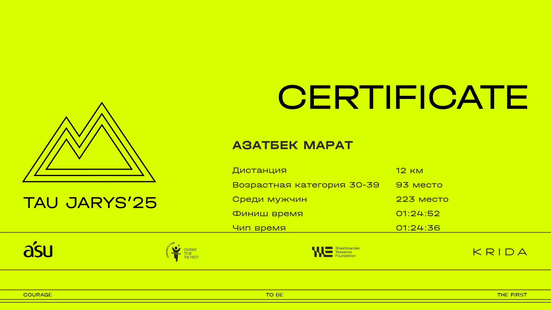 | 255 | Азатбек Марат | ![]() | Алматы | 417 | 00:10:40.00 | 00:25:53.40 | 00:33:35.20 | 00:52:15.40 | 01:09:19.80 | 01:17:36.00 | 01:24:52.70 | 01:24:36.00 | Скачать |