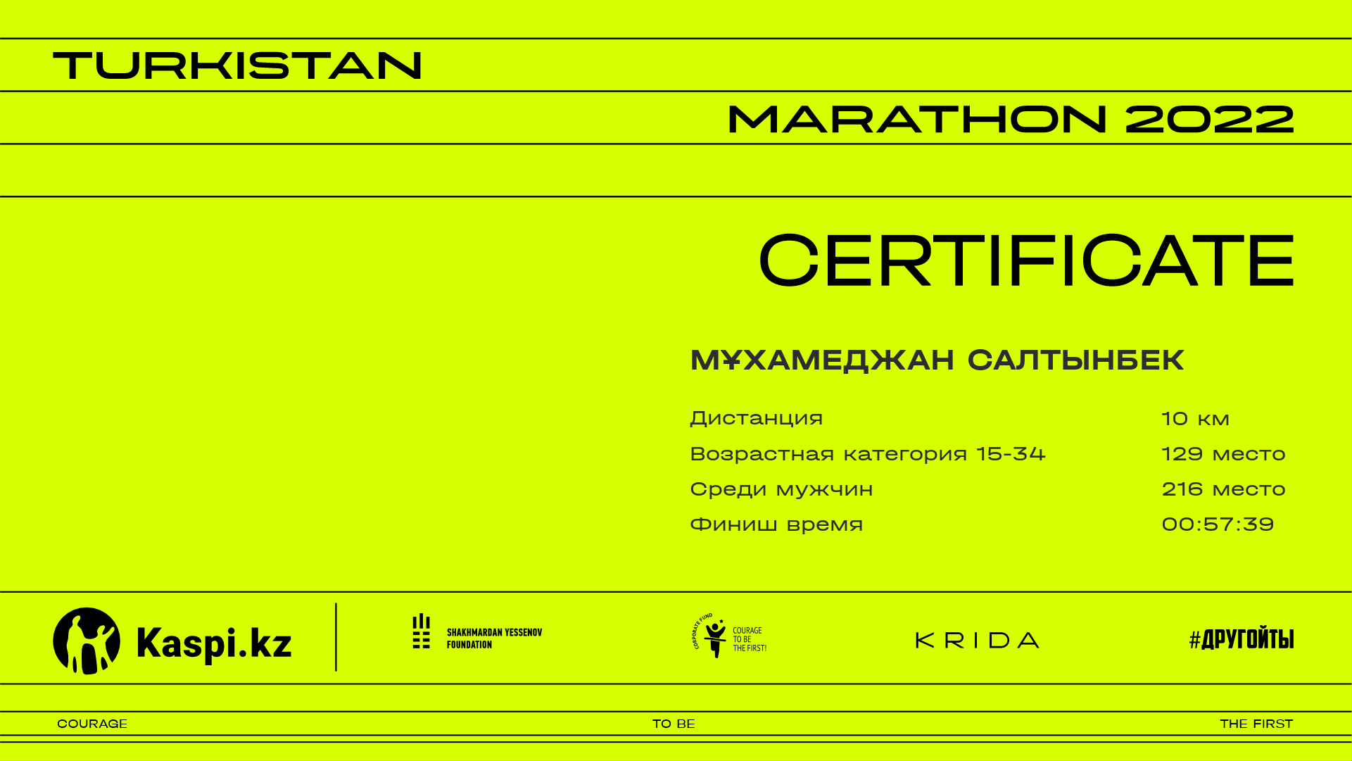 | 300 | Фархад Халмуратов | ![]() | Шымкент | 1444 | 00:30:32.33 | 00:58:15.00 | 00:57:53.25 | Скачать |