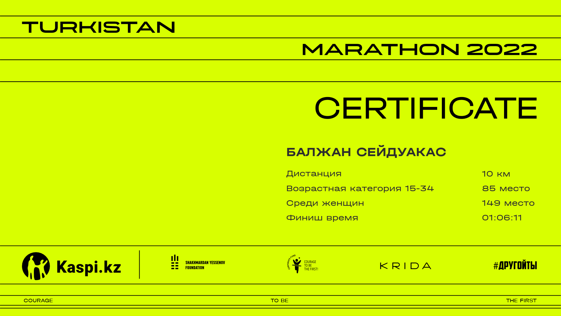 | 454 | Акнур Атамбаева | ![]() | Шымкент | 1160 | 00:33:51.54 | 01:06:17.54 | 01:05:38.72 | Скачать |