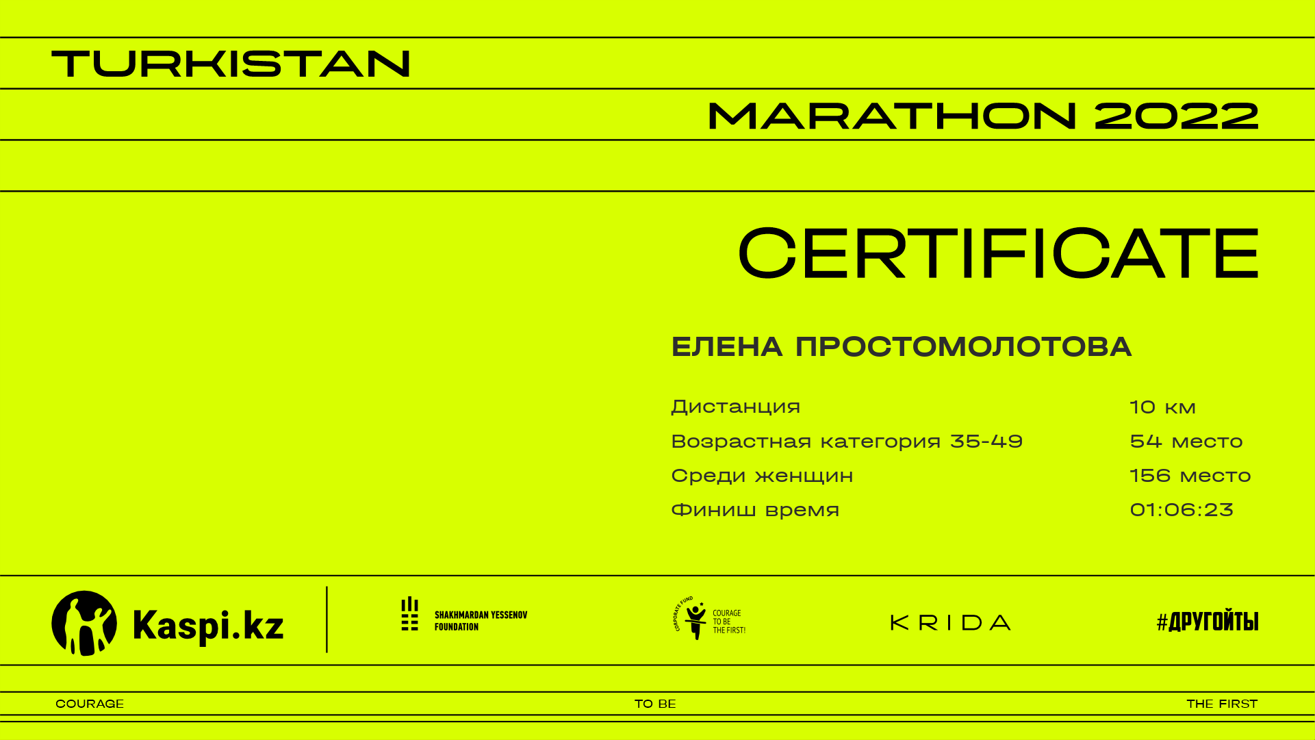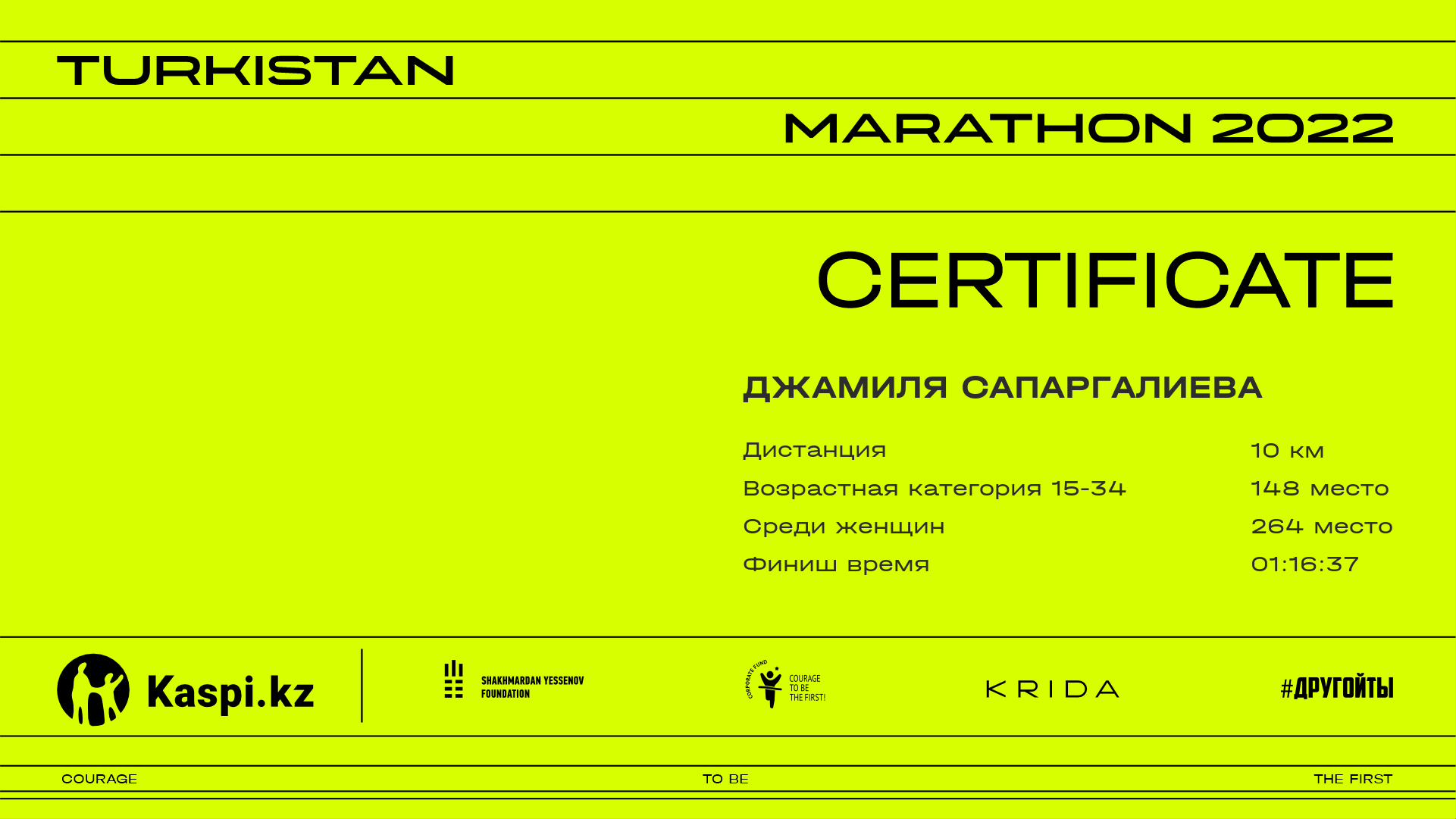 | 503 | Разиям Мухамедьярова | ![]() | Алматы | 1517 | 00:33:19.05 | 01:08:00.96 | 01:07:56.71 | Скачать |