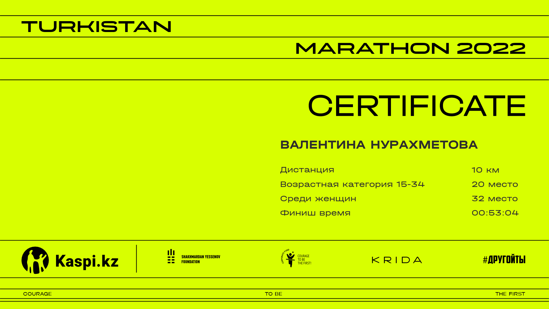 | 138 | Роза Аллоярова | ![]() | Алматы | 838 | 00:25:29.17 | 00:50:14.32 | 00:49:56.19 | Скачать |