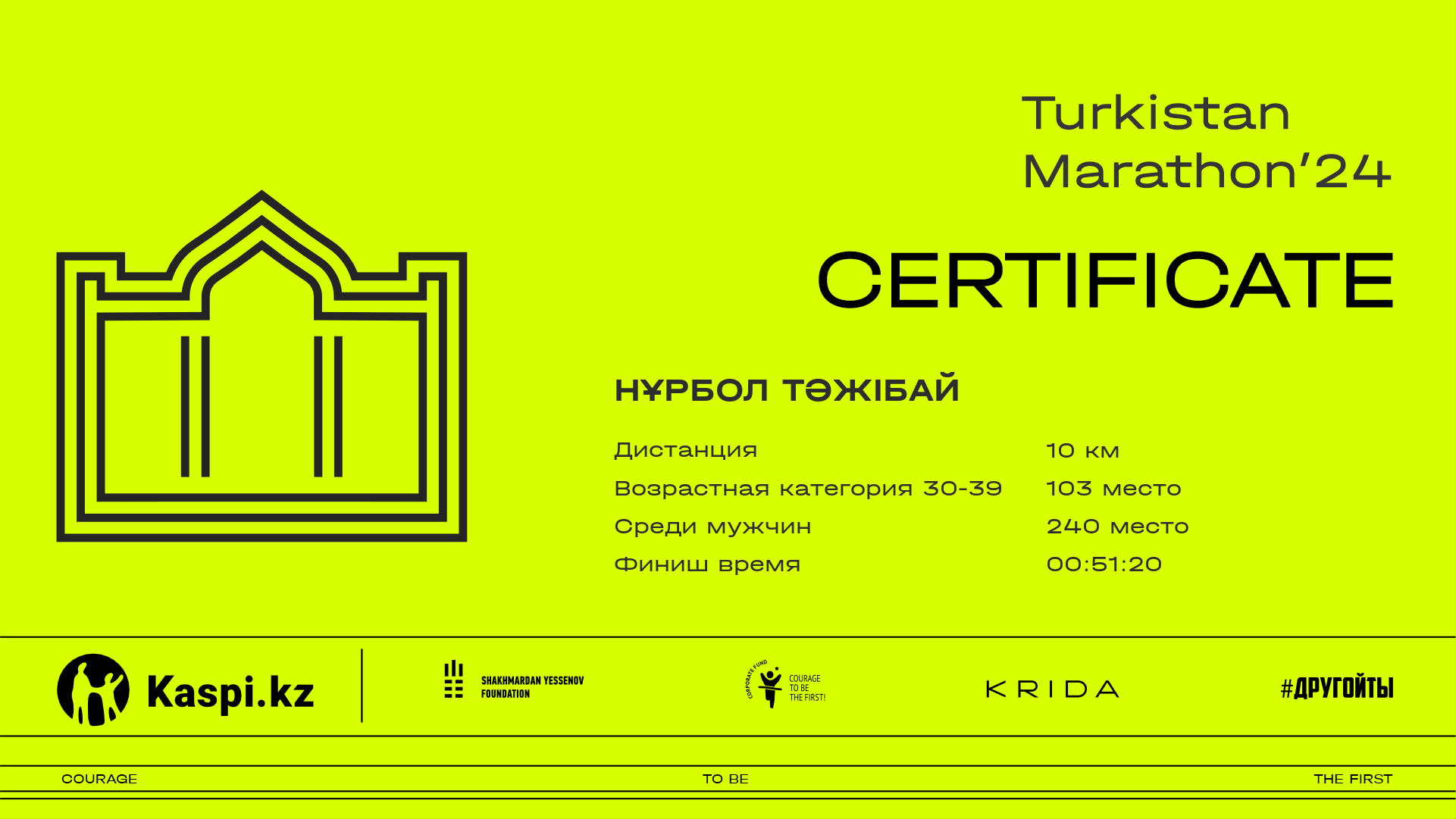 | 277 | Rakym Zhussip | ![]() | Шымкент | 1490 | 00:27:32 | 00:51:02 | 00:50:32 | Скачать |