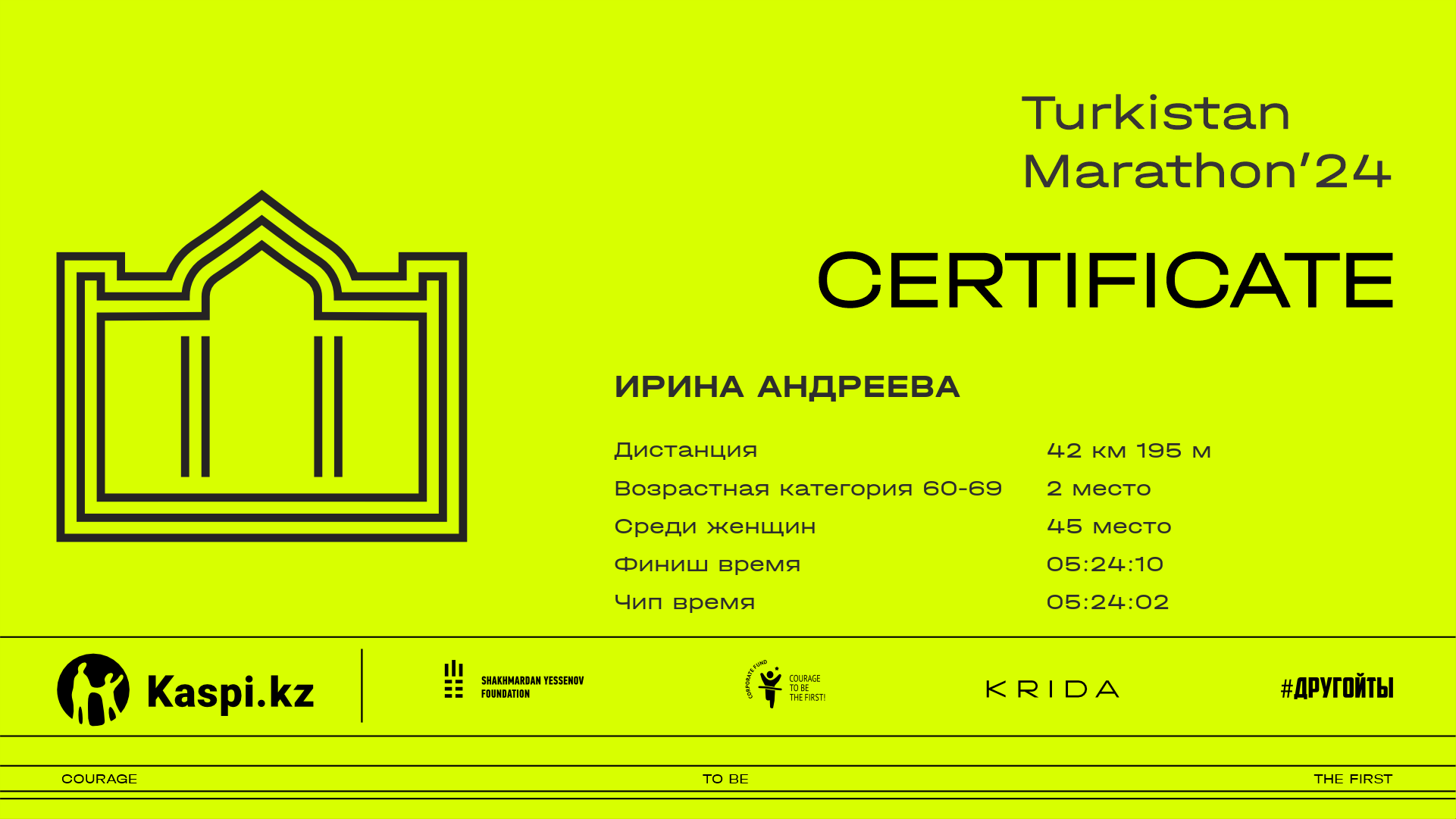 | 33 | Нургуль Жумагали | ![]() | Шымкент | 134 | 00:27:42 | 00:58:24 | 01:59:32 | 03:05:01 | 03:41:31 | 04:13:23 | 04:13:13 | Скачать |
