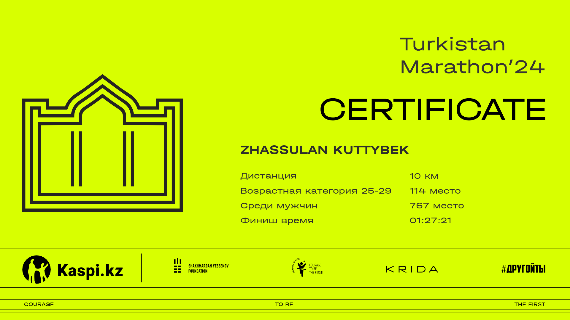 | 1037 | Шермат Ибрагимов | ![]() | Түркістан | 2321 | 00:39:46 | 01:16:13 | 01:15:09 | Скачать |