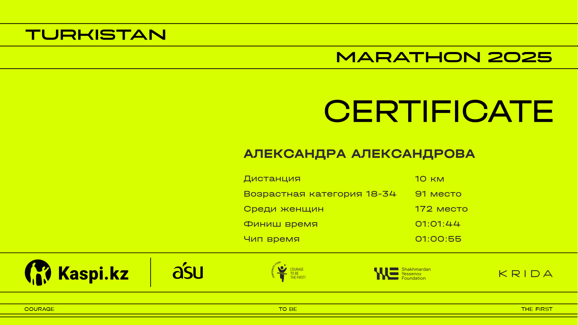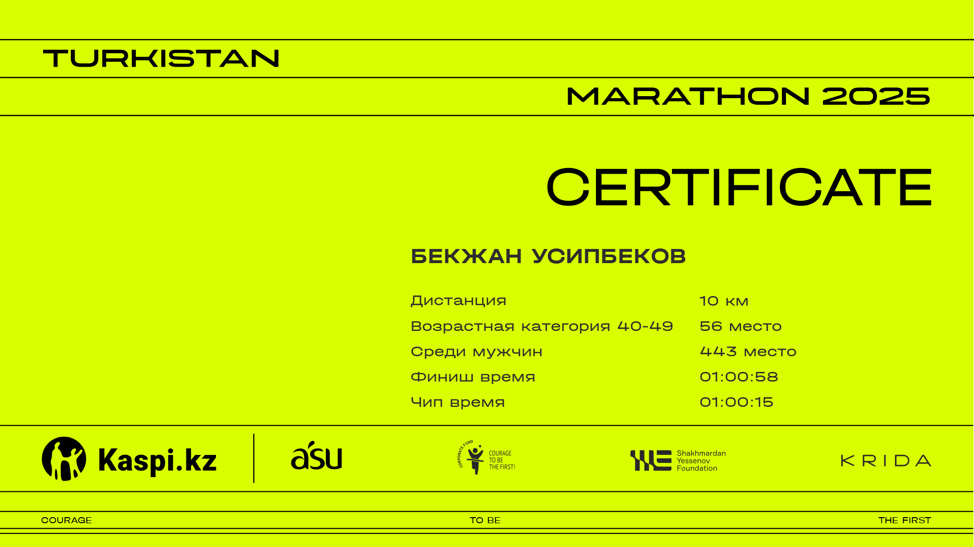| 603 | Abylaikhan Abishov | ![]() | Шымкент | 1977 | 00:37:36 | 01:00:42 | 00:59:59 | Скачать |