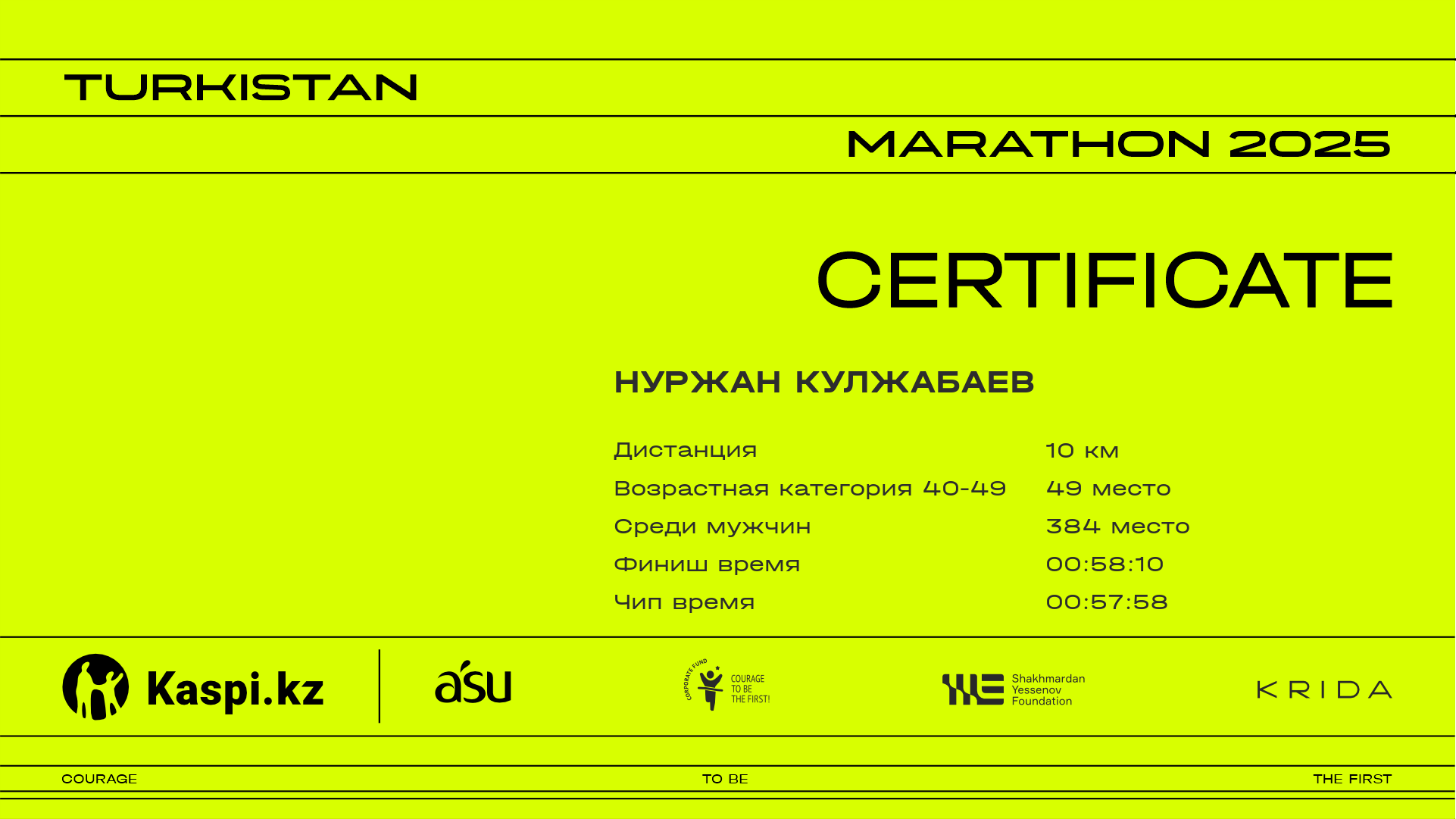 | 520 | Нуржан Кулжабаев | ![]() | Шымкент | 1657 | 00:34:58 | 00:58:10 | 00:57:58 | Скачать |
