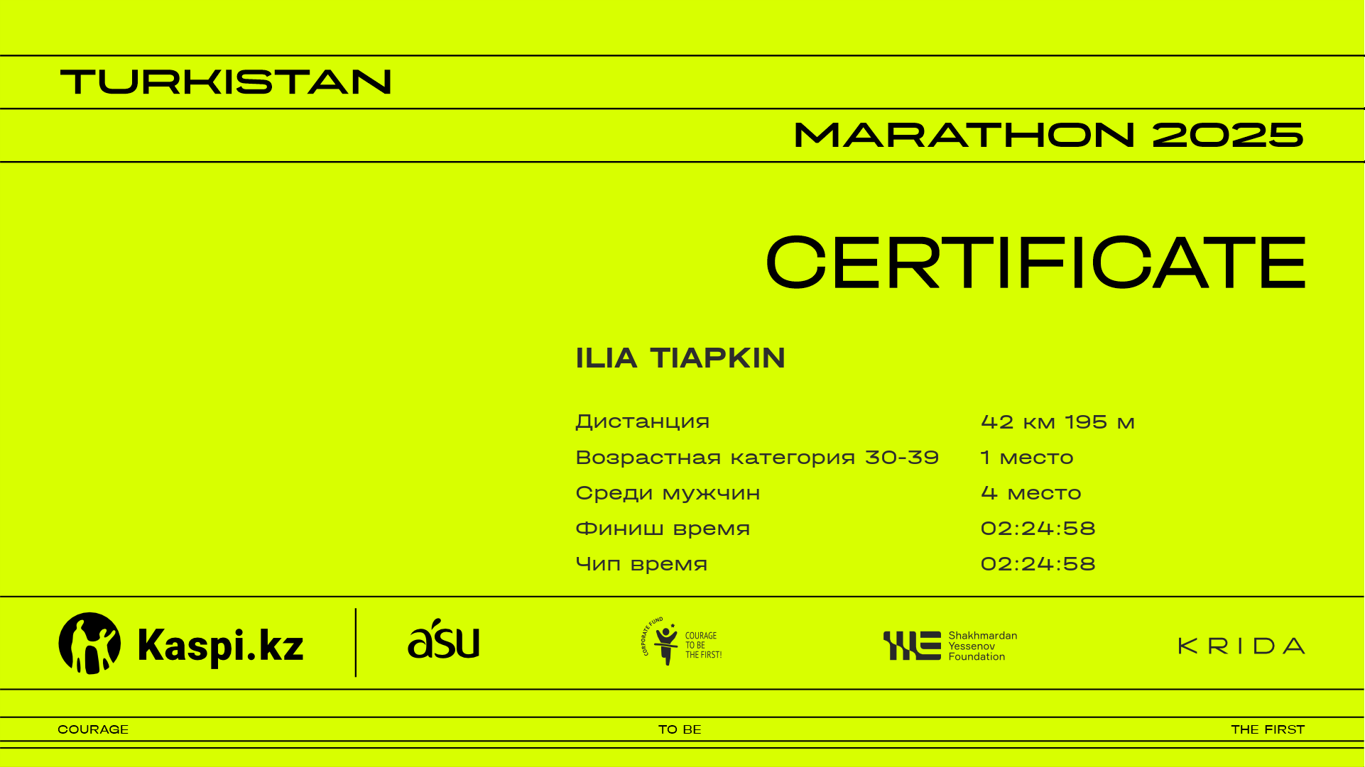 | 1 | Андрей Петров | ![]() | Алматы | 398 | 00:20:36 | 00:39:01 | 00:50:05 | 01:14:04 | 01:36:55 | 01:47:13 | 02:04:46 | 02:16:58 | 02:16:58 | Скачать |