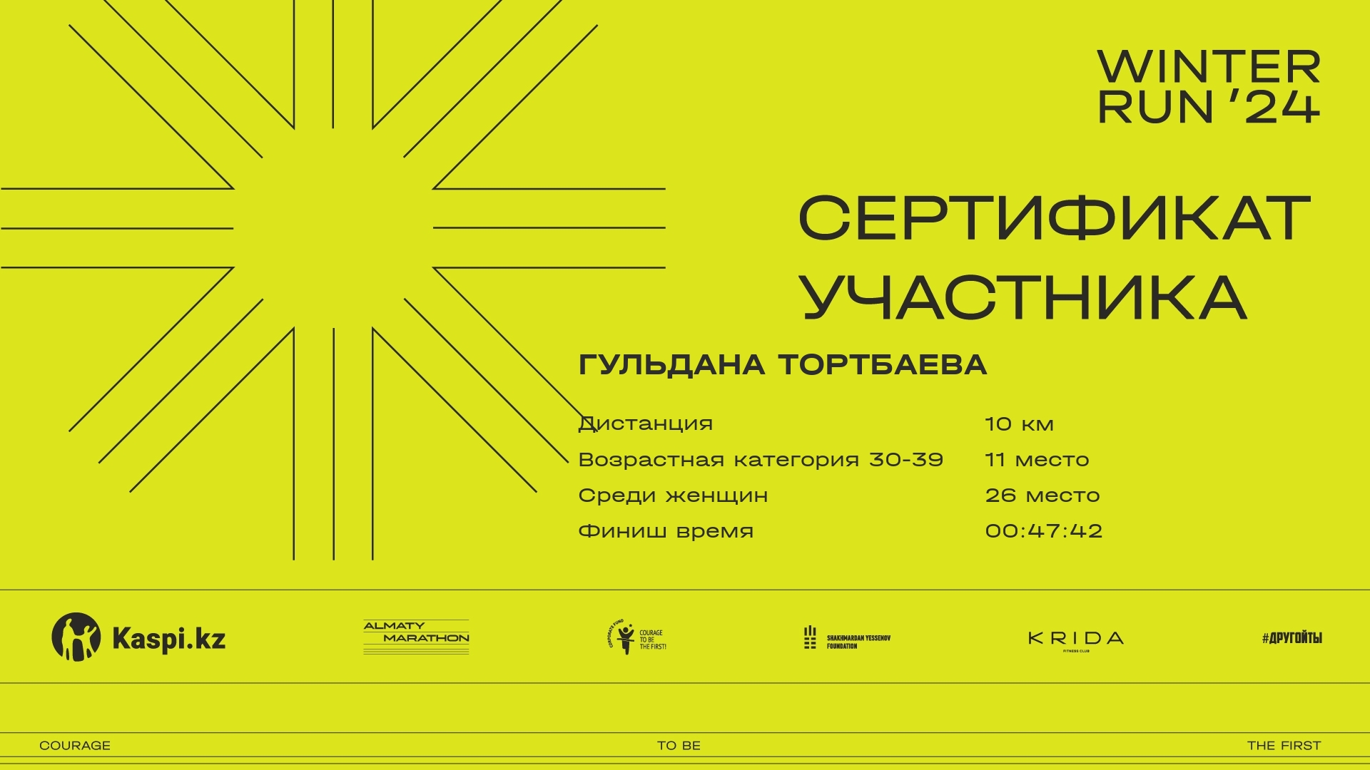 | 284 | Гульдана Тортбаева | ![]() | Алматы | 1053 | 00:07:13 | 00:25:03 | 00:40:11 | 00:47:42 | 00:47:36 | Скачать |