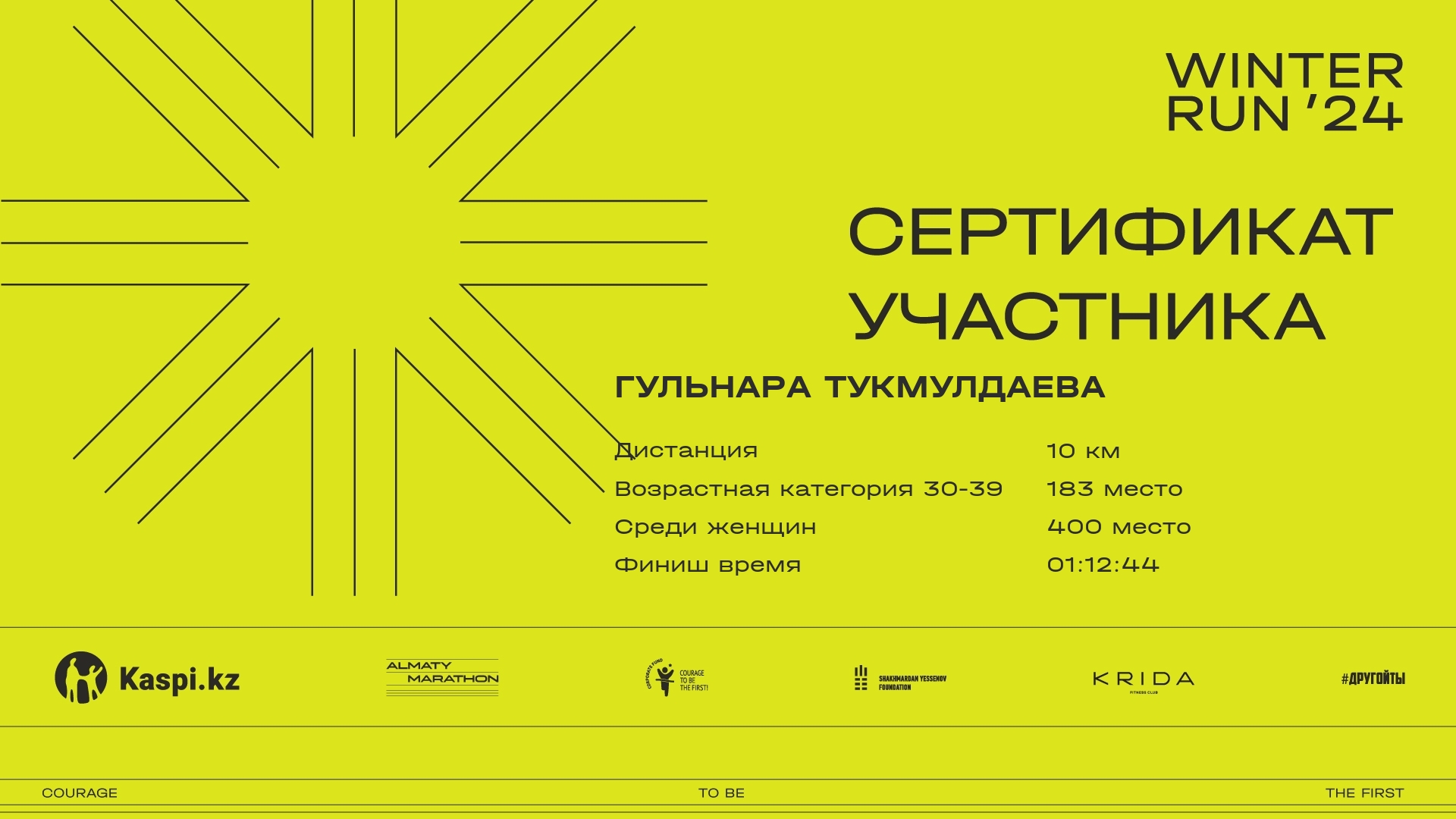 | 1697 | Меруерт Абдрахманова | ![]() | Алматы | 1219 | 00:11:17 | 00:41:54 | 01:08:02 | 01:22:16 | 01:21:08 | Скачать |