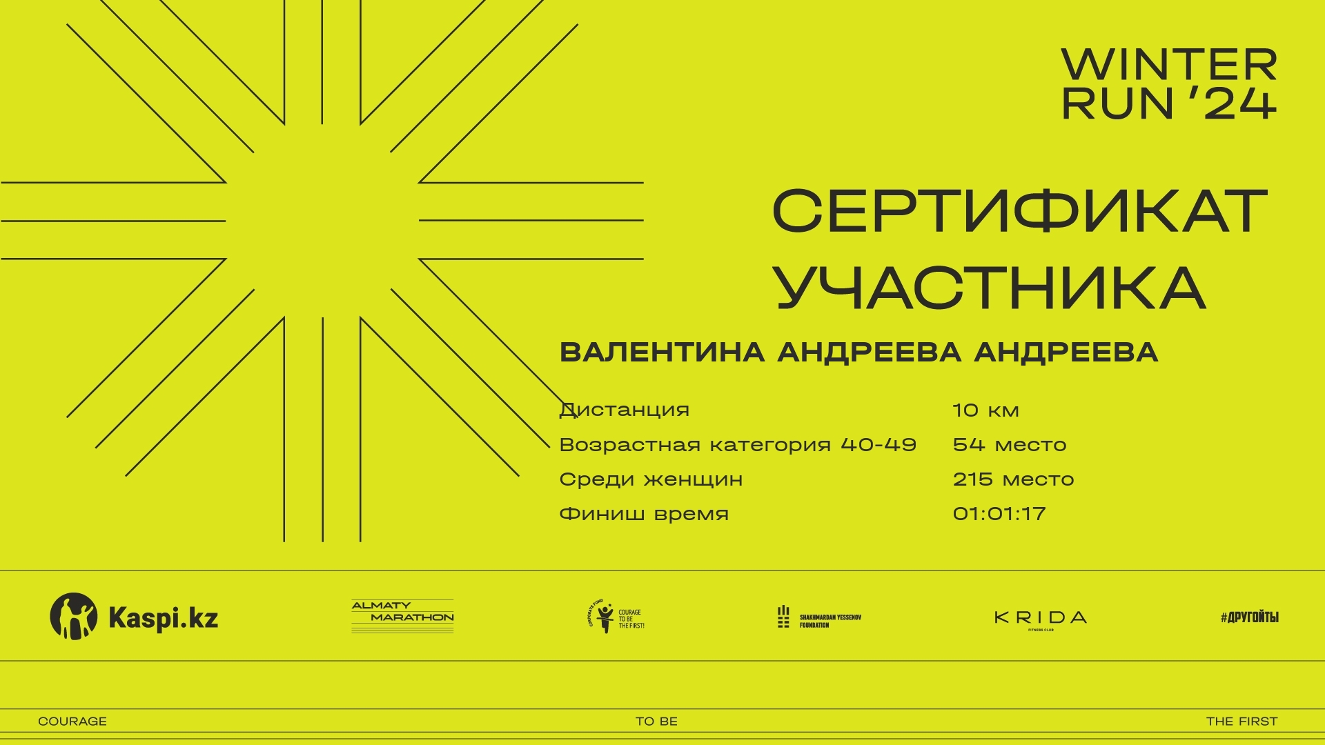 | 1477 | Akbota Nurtayeva | ![]() | Almaty | 43 | 00:10:58 | 00:36:30 | 01:00:31 | 01:12:22 | 01:11:04 | Скачать |