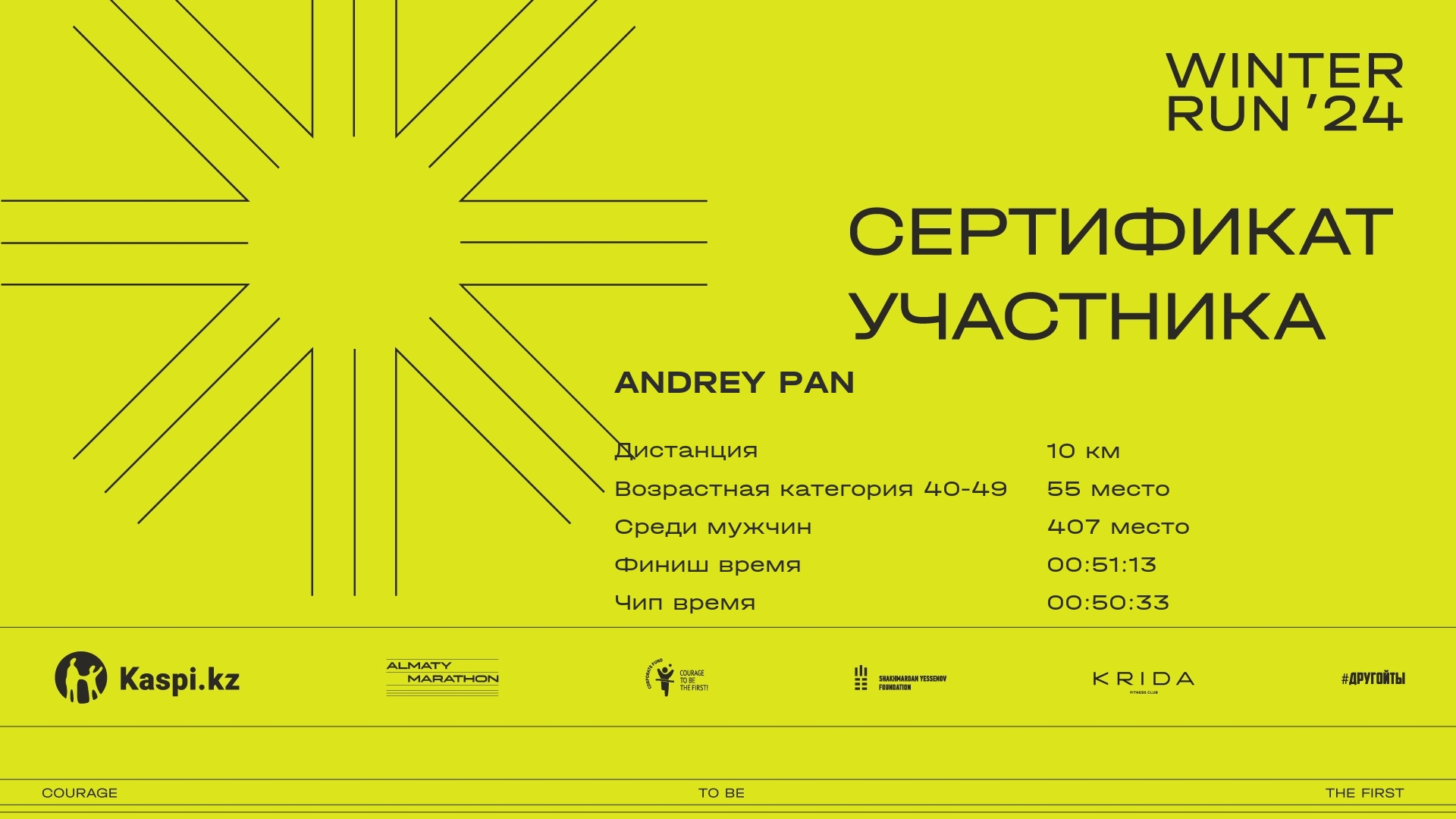 | 474 | Данияр Каликулов | ![]() | Алматы | 198 | 00:07:10 | 00:25:02 | 00:43:23 | 00:51:14 | 00:51:04 | Скачать |