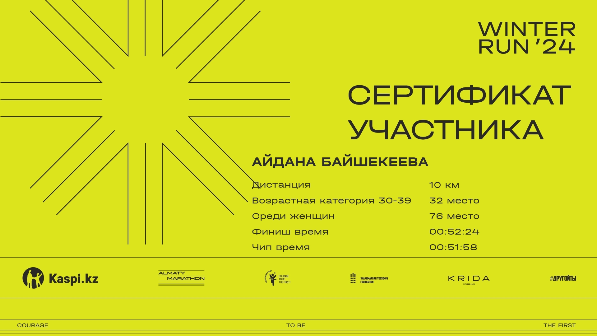 | 530 | Айдана Байшекеева | ![]() | Алматы | 1331 | 00:08:30 | 00:28:17 | 00:44:37 | 00:52:24 | 00:51:58 | Скачать |