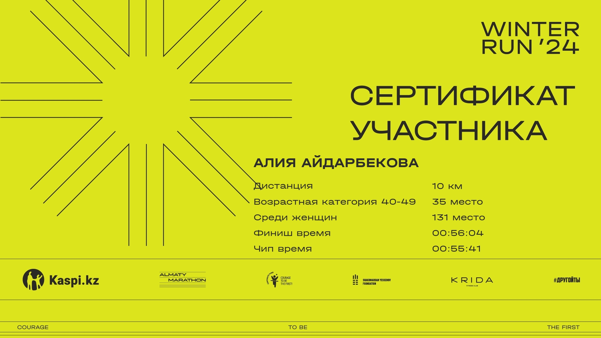 | 346 | Айнагуль Баядилова | ![]() | Алматы | 1653 | 00:07:24 | 00:25:23 | 00:41:29 | 00:49:10 | 00:48:59 | Скачать |