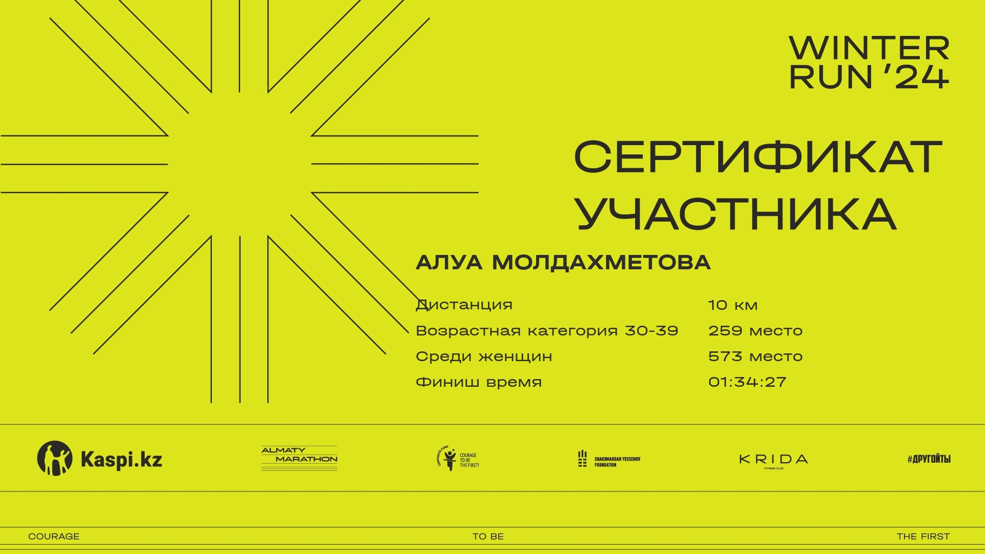 | 1729 | Жанмира Каусылова | ![]() | Караганда | 1076 | 00:12:42 | 00:45:09 | 01:11:36 | 01:25:38 | 01:24:23 | Скачать |