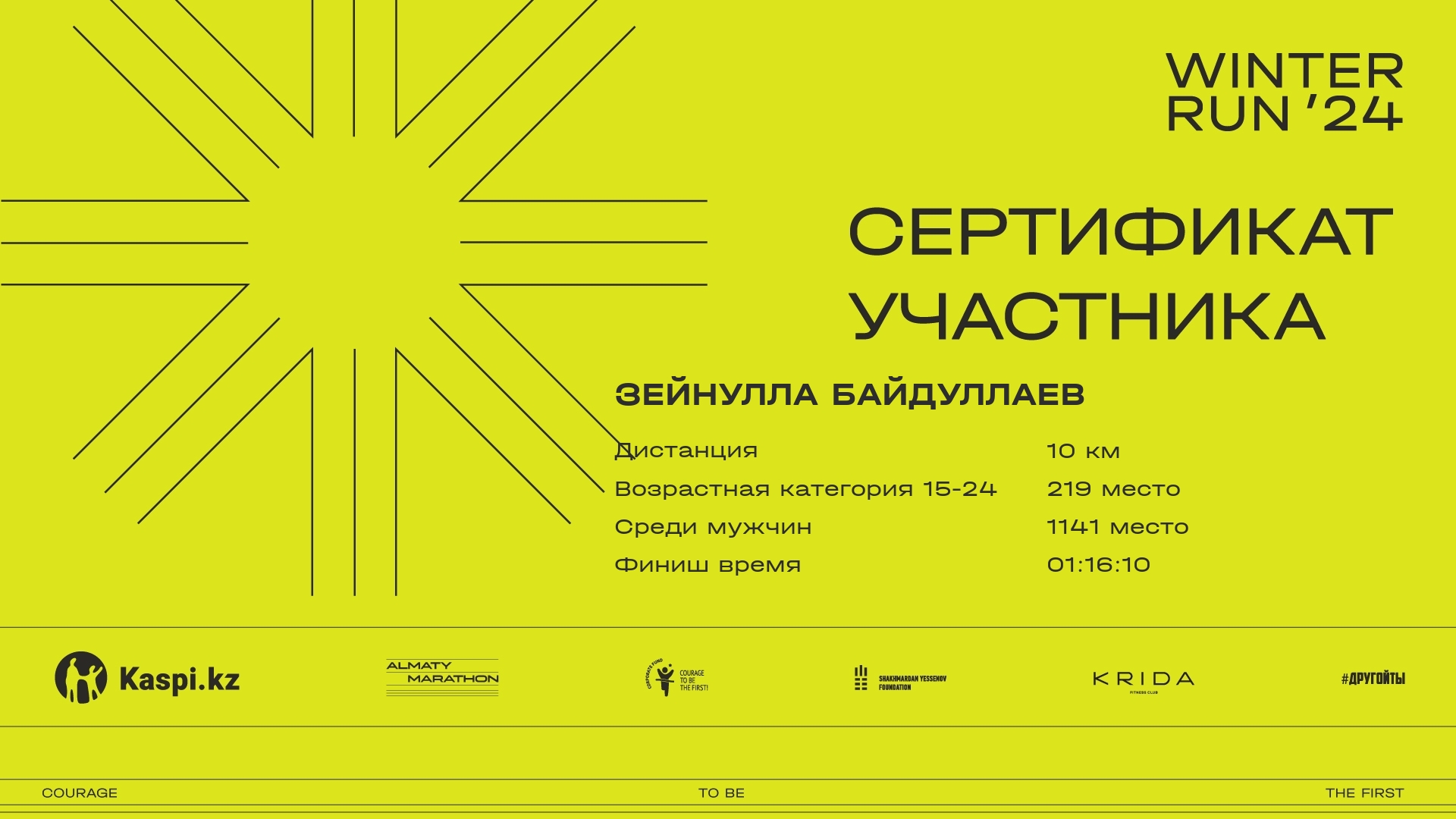 | 1585 | Зейнулла Байдуллаев | ![]() | Алматы | 305 | 00:11:47 | 00:39:33 | 01:04:14 | 01:16:10 | 01:15:05 | Скачать |