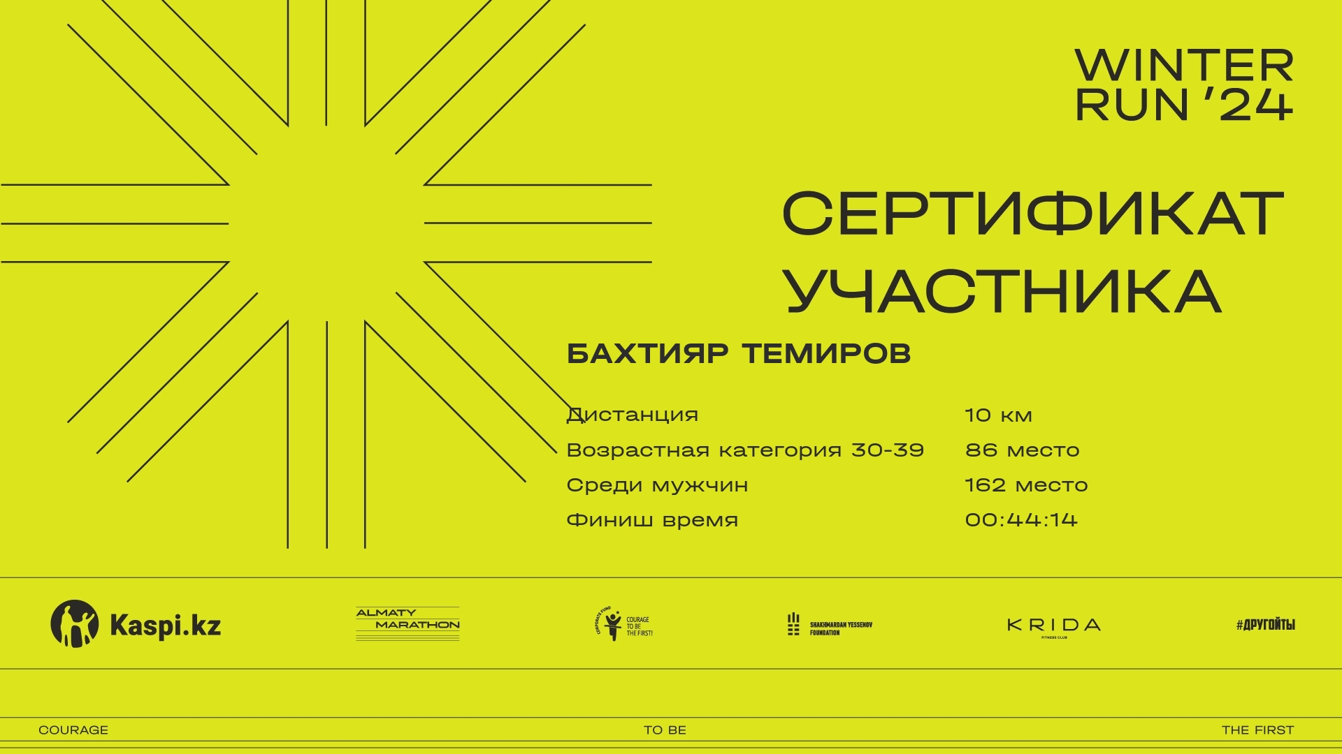 | 161 | Евгений Ким | ![]() | Алматы | 773 | 00:06:33 | 00:22:39 | 00:37:12 | 00:43:48 | 00:43:43 | Скачать |