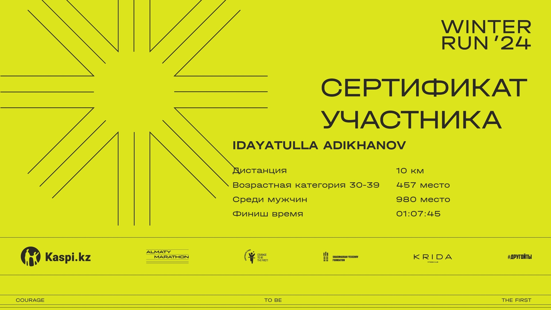 | 1574 | Temirlan Kussaiyn | ![]() | Almaty | 2027 | 00:11:30 | 00:39:12 | 01:03:32 | 01:15:32 | 01:14:17 | Скачать |