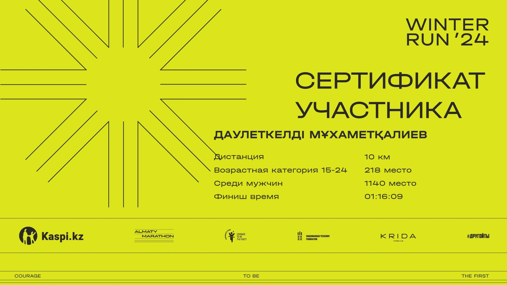 | 1582 | Даулеткелді Мұхаметқалиев | ![]() | Алматы | 246 | 00:10:20 | 00:39:44 | 01:04:13 | 01:16:09 | 01:14:39 | Скачать |