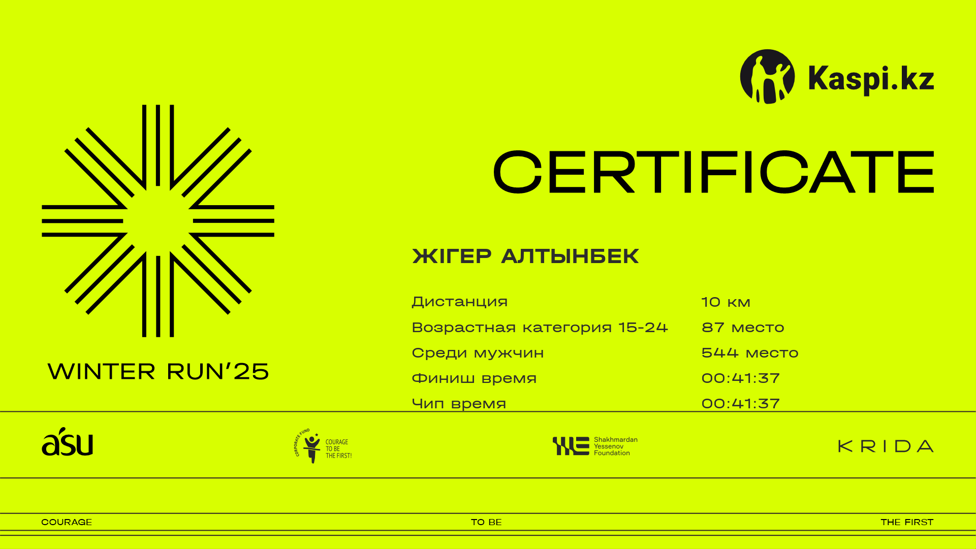 | 1410 | Amirkhan Zhaksylyk | ![]() | Almaty | 425 | 00:28:22 | 00:54:52 | 01:17:31 | 01:16:40 | Скачать |