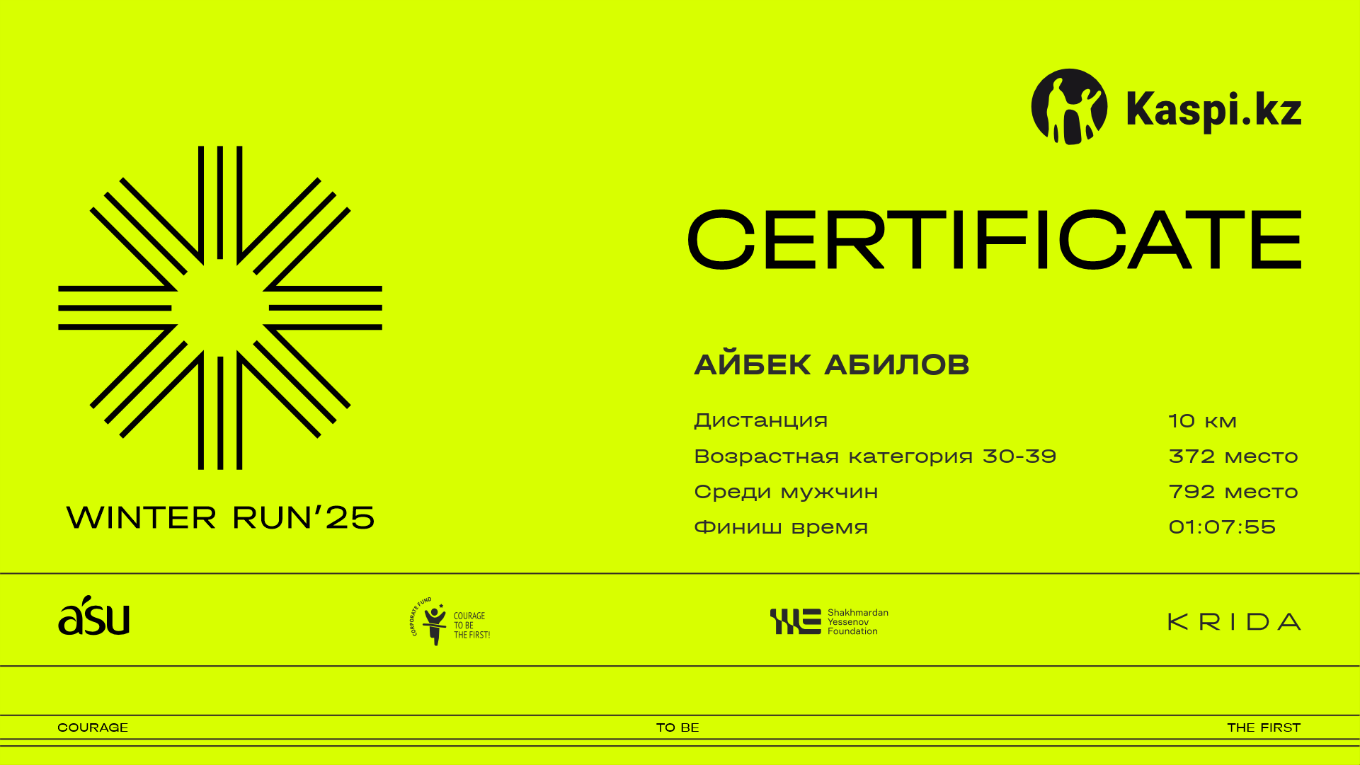 | 1234 | Галымжан Сарекеев | ![]() | Алматы | 1783 | 00:26:52 | 00:49:46 | 01:11:16 | 01:10:33 | Скачать |