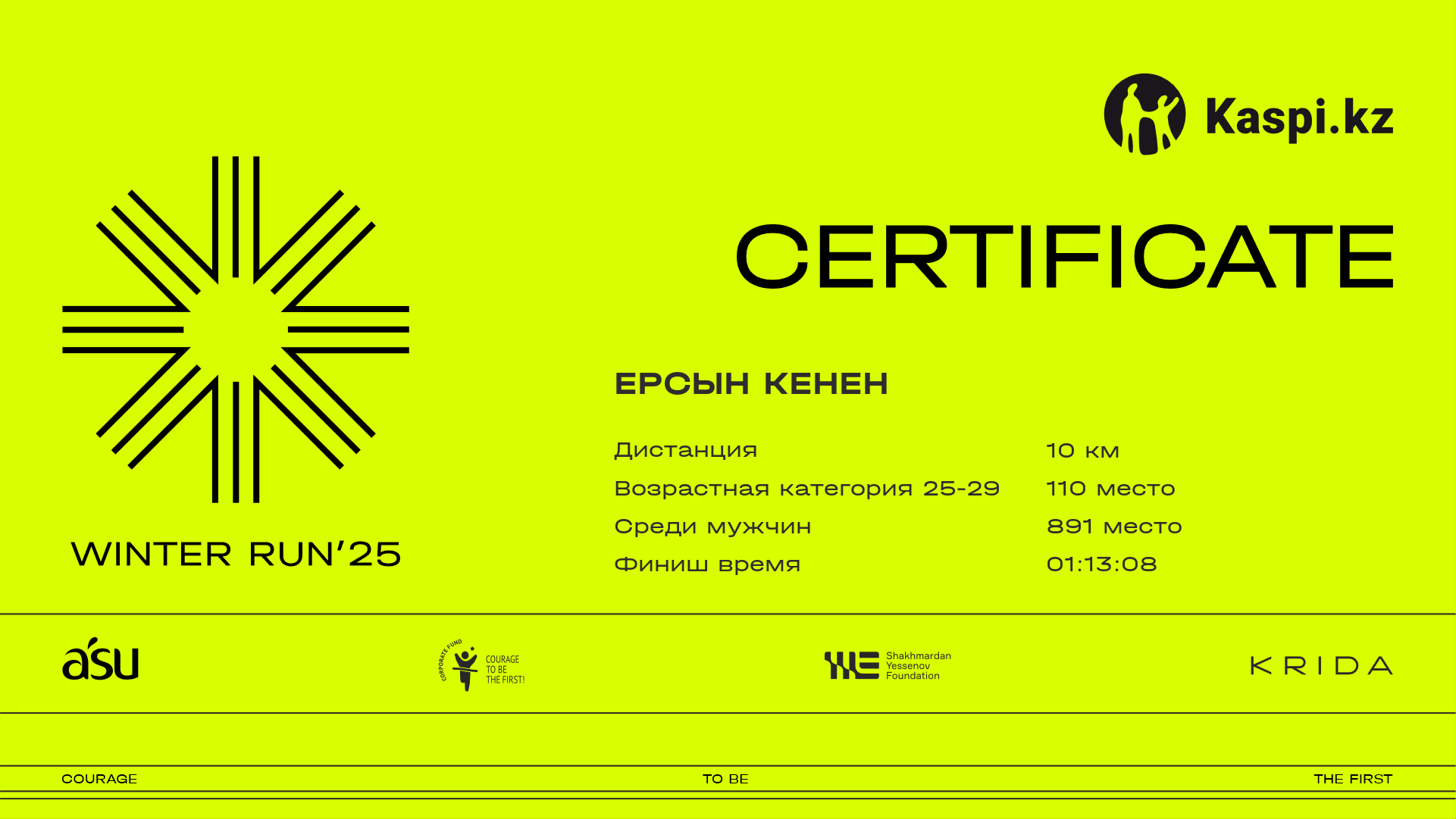 | 1296 | Ерсын Кенен | ![]() | Алматы | 231 | 00:28:01 | 00:52:13 | 01:13:08 | 01:12:25 | Скачать |
