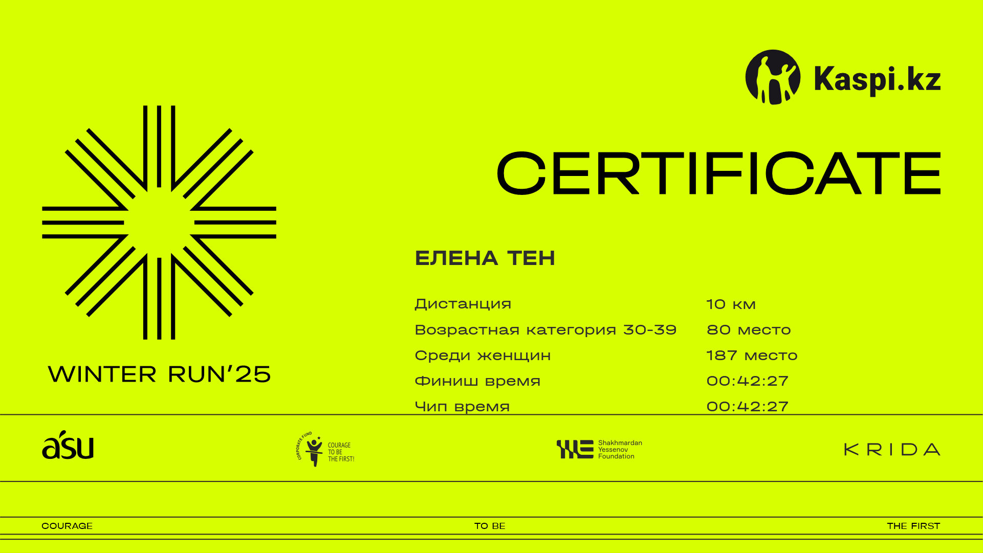 | 383 | Ксения Козюра | ![]() | Алматы | 790 | 00:20:23 | 00:37:21 | 00:51:29 | 00:51:22 | Скачать |