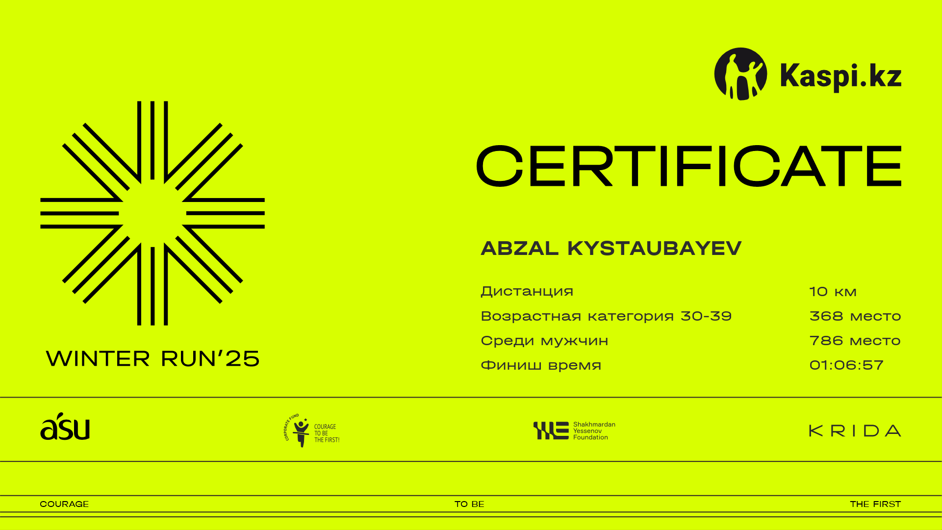| 389 | ABZAL BEKMURZAYEV | ![]() | Алматы | 671 | 00:21:37 | 00:37:52 | 00:51:47 | 00:51:32 | Скачать |