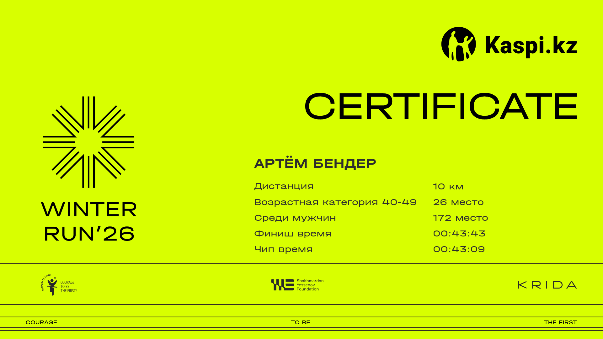 | 1340 | Артём Берген | ![]() | Алматы | 1982 | 00:08:37.73 | 00:31:53.24 | 00:53:52.72 | 01:04:21.91 | 01:03:49.27 | Скачать |