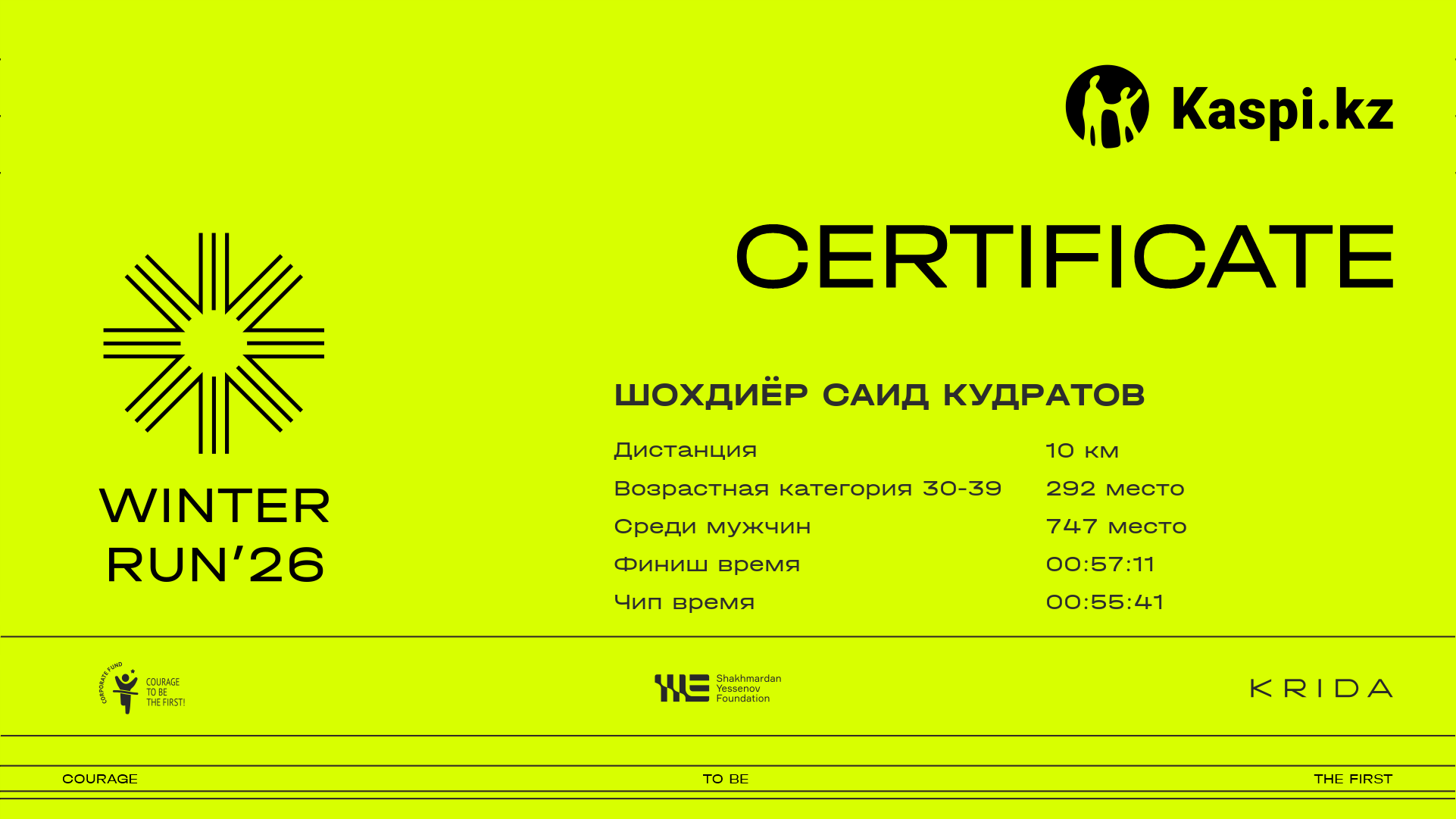 | 1175 | Шухрат Караходжаев | ![]() | Бишкек | 86 | 00:09:14.14 | 00:31:42.63 | 00:51:53.92 | 01:01:26.09 | 01:00:38.60 | Скачать |
