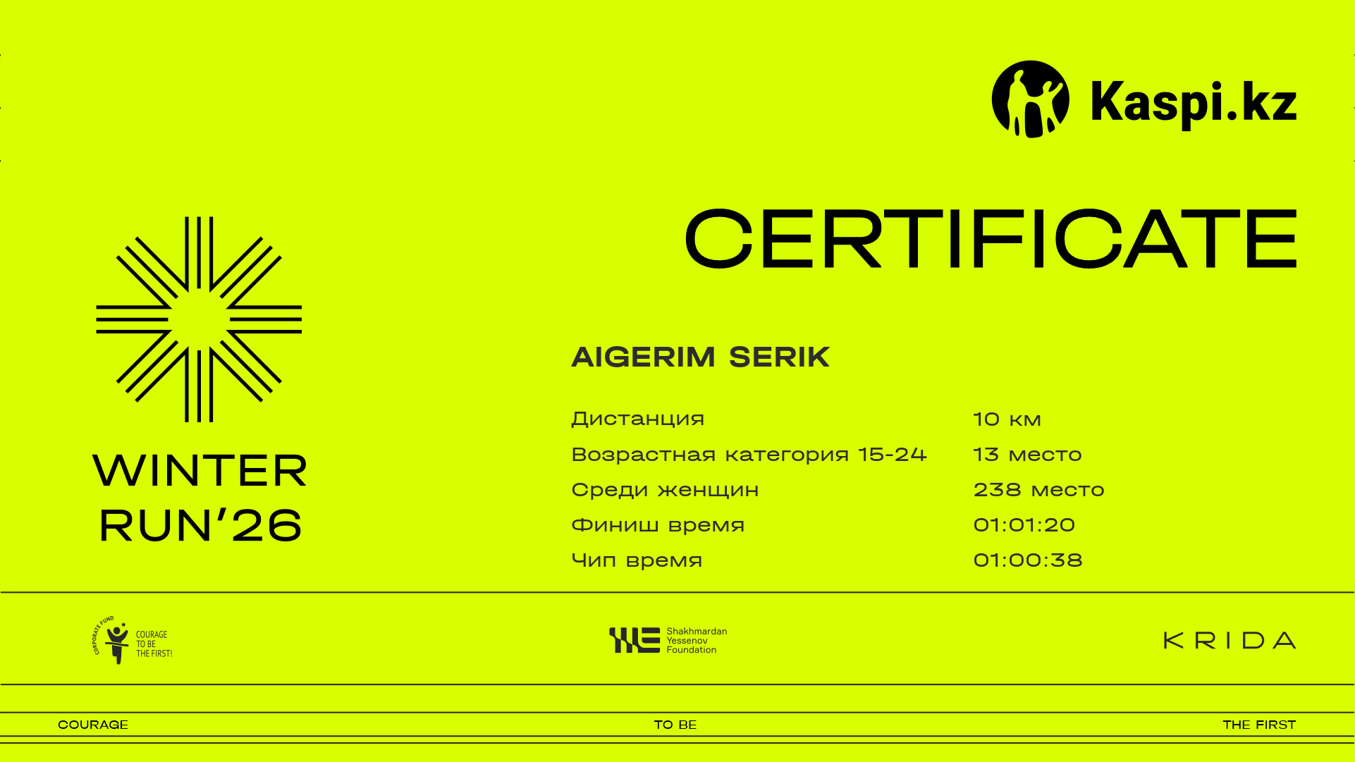 | 1261 | Aigerim Myrzakhmetova | ![]() | Алматы | 1293 | 00:09:32.15 | 00:32:24.45 | 00:53:24.97 | 01:03:02.21 | 01:02:02.53 | Скачать |